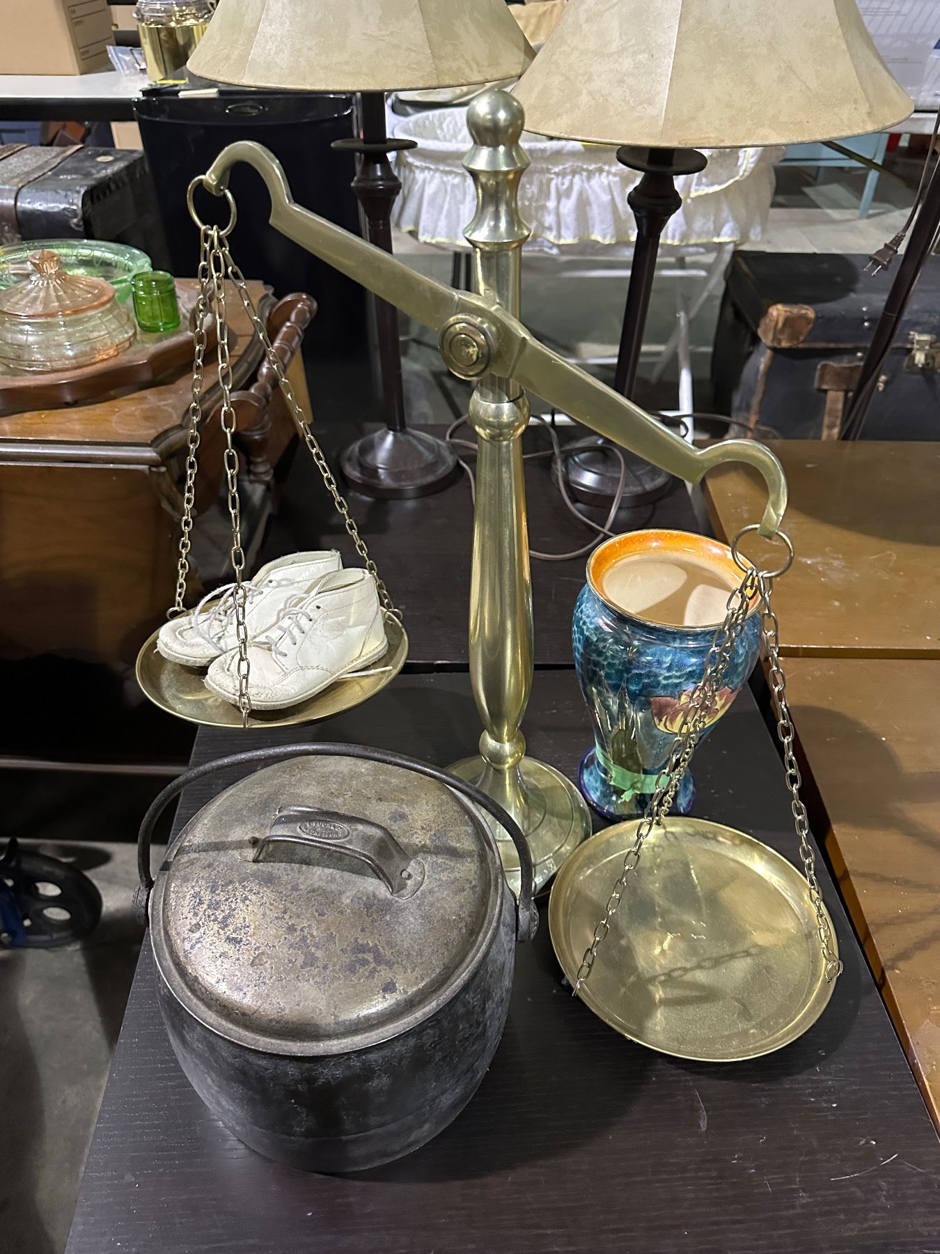 Group of misc items including - decorative vase, Vintage large scales of justice, Covered nickel bean pot with lid and handle, etc...