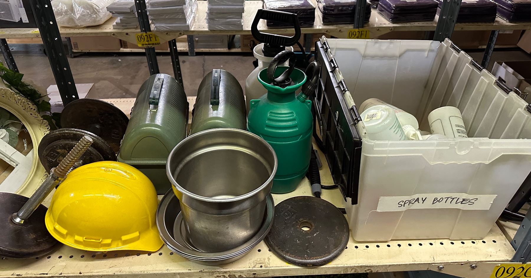 Group of misc. items including - dumbbells, construction hat, spray bottles, 2 Stanley tool boxes, plant spray bottles, mirror, fan, flashlight, soap dispensers,