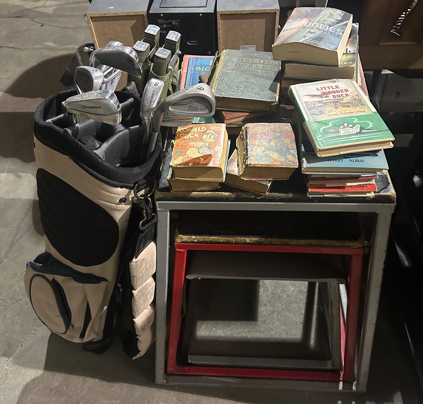 Group of misc items including - golf club bag w/few clubs, fitness platform box, vintage 1930's era books, etc...