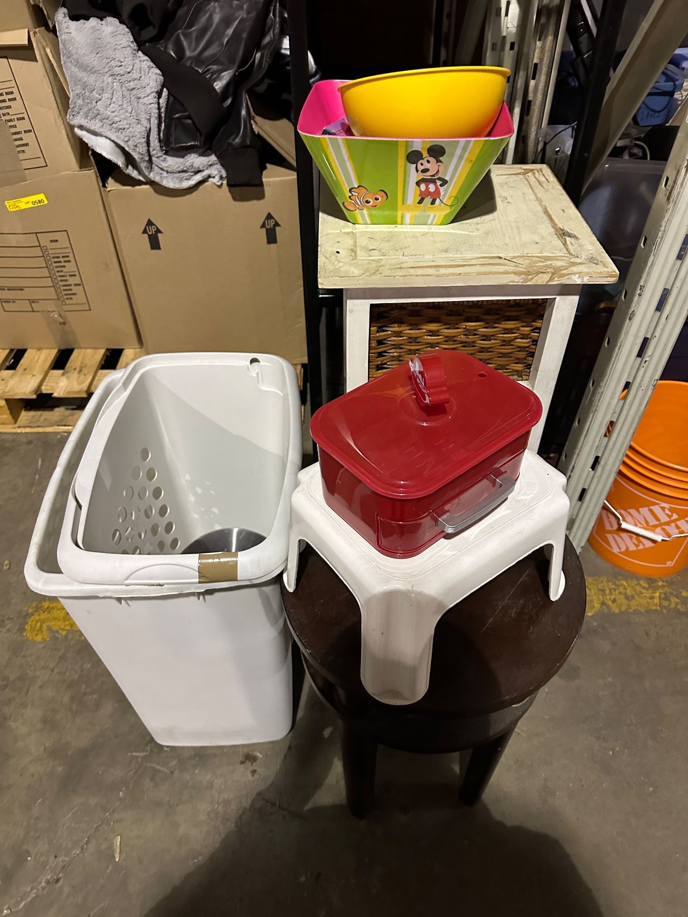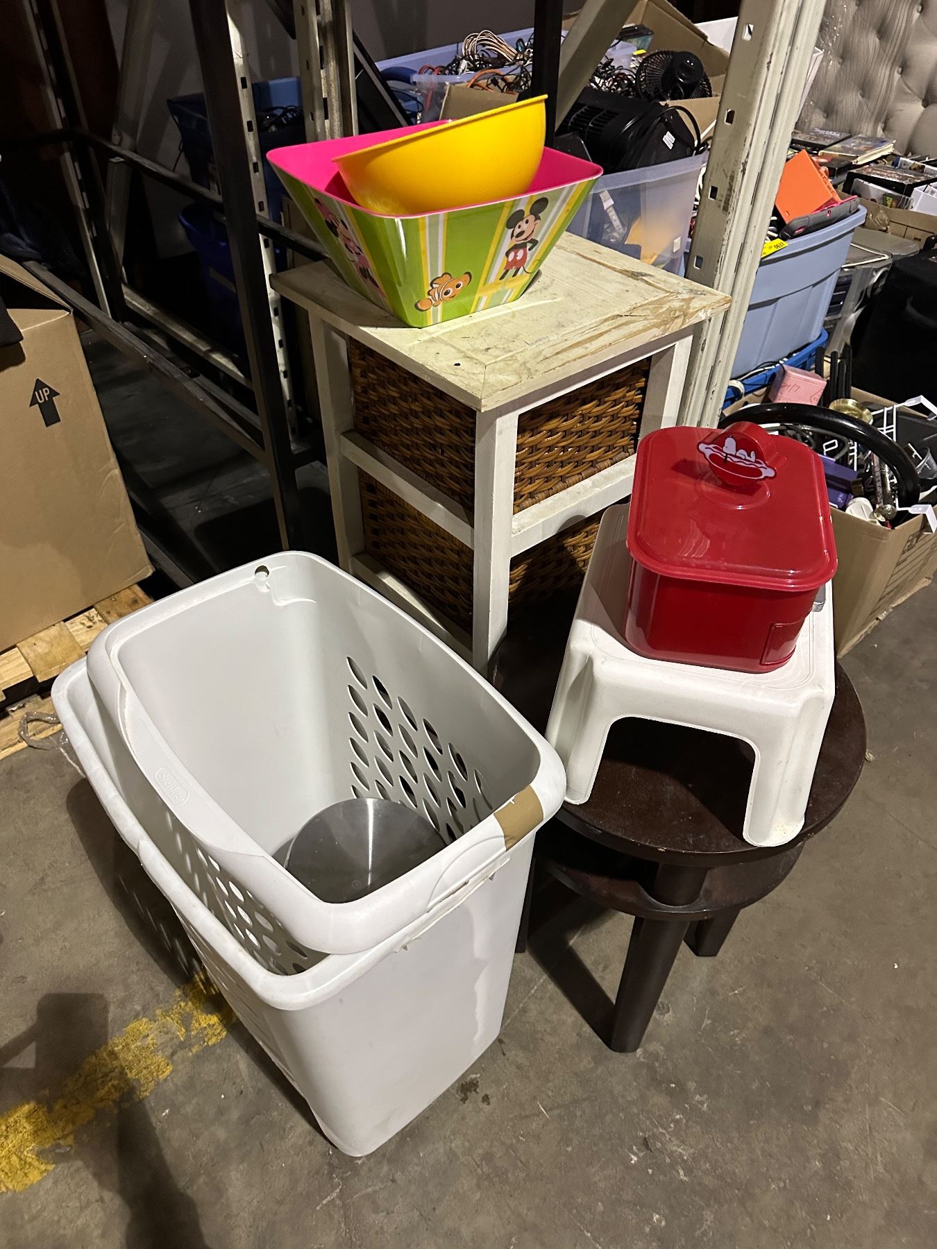 Group of misc items including - laundry baskets, stool, side table, basket storage shelf, etc...