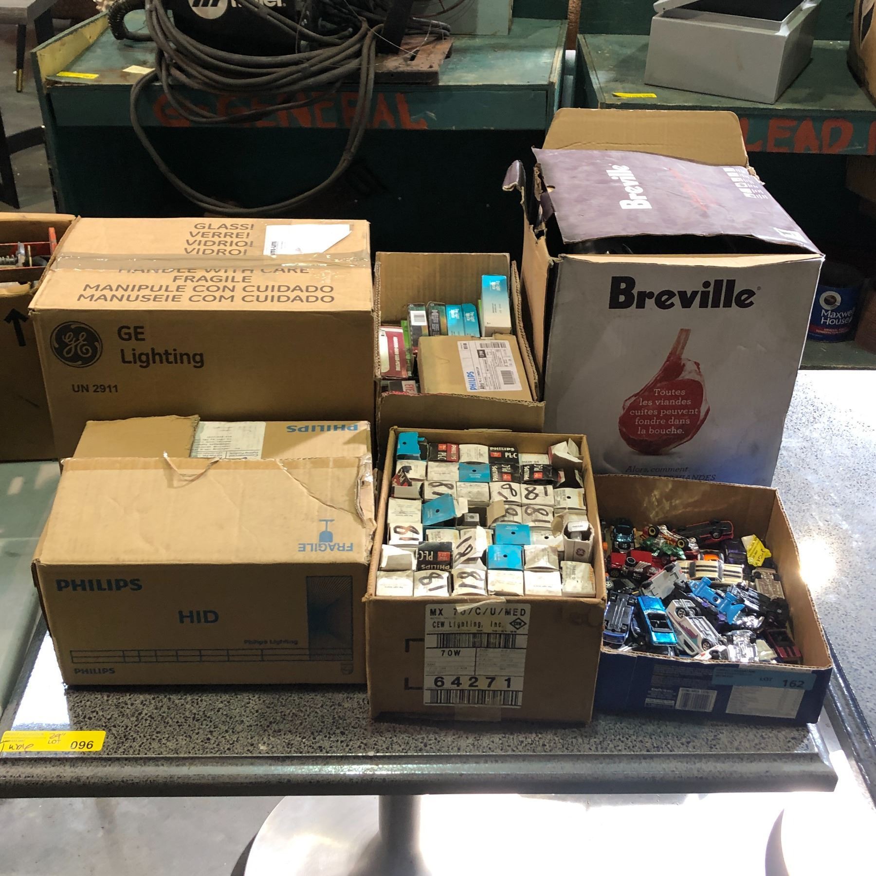 Group of misc items including - toy cars, 4 boxes, Breville fast cooker, etc...