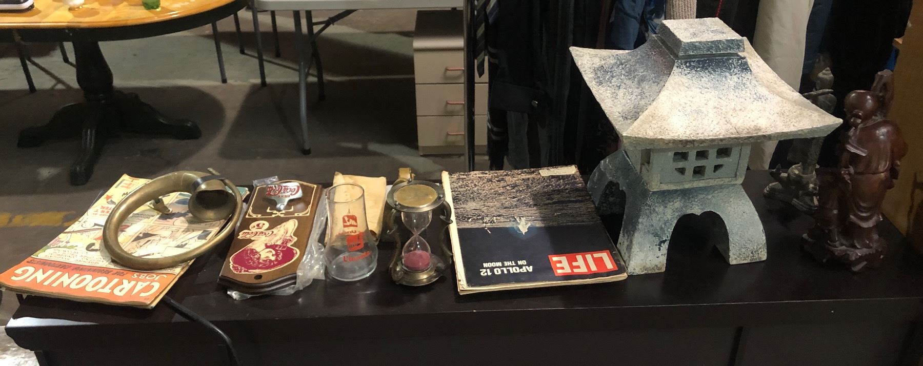 Group of misc items including - vintage Coke bottle opener, Asian style decor, vintage Life magazine, cartoons, hour glass, etc...