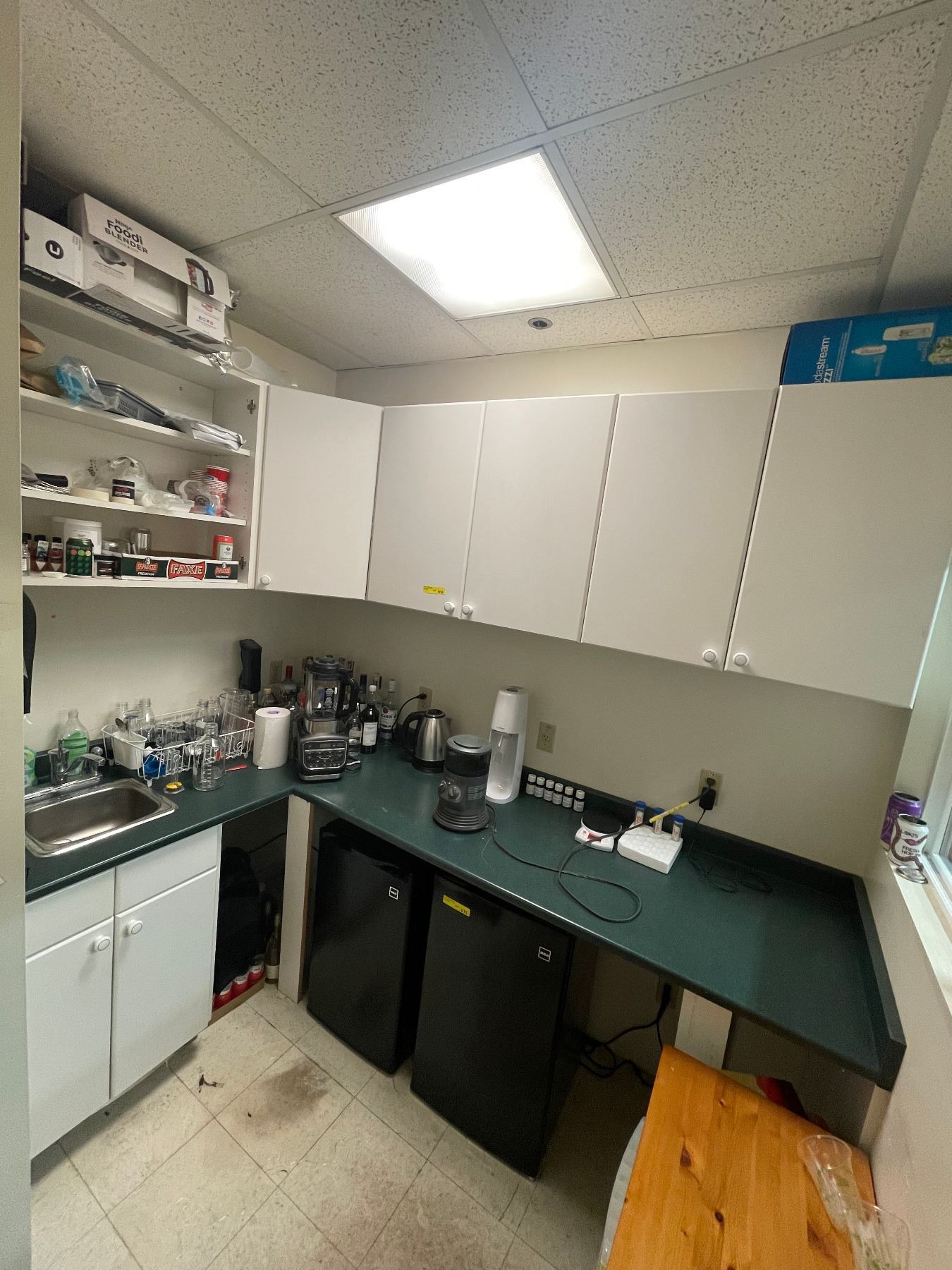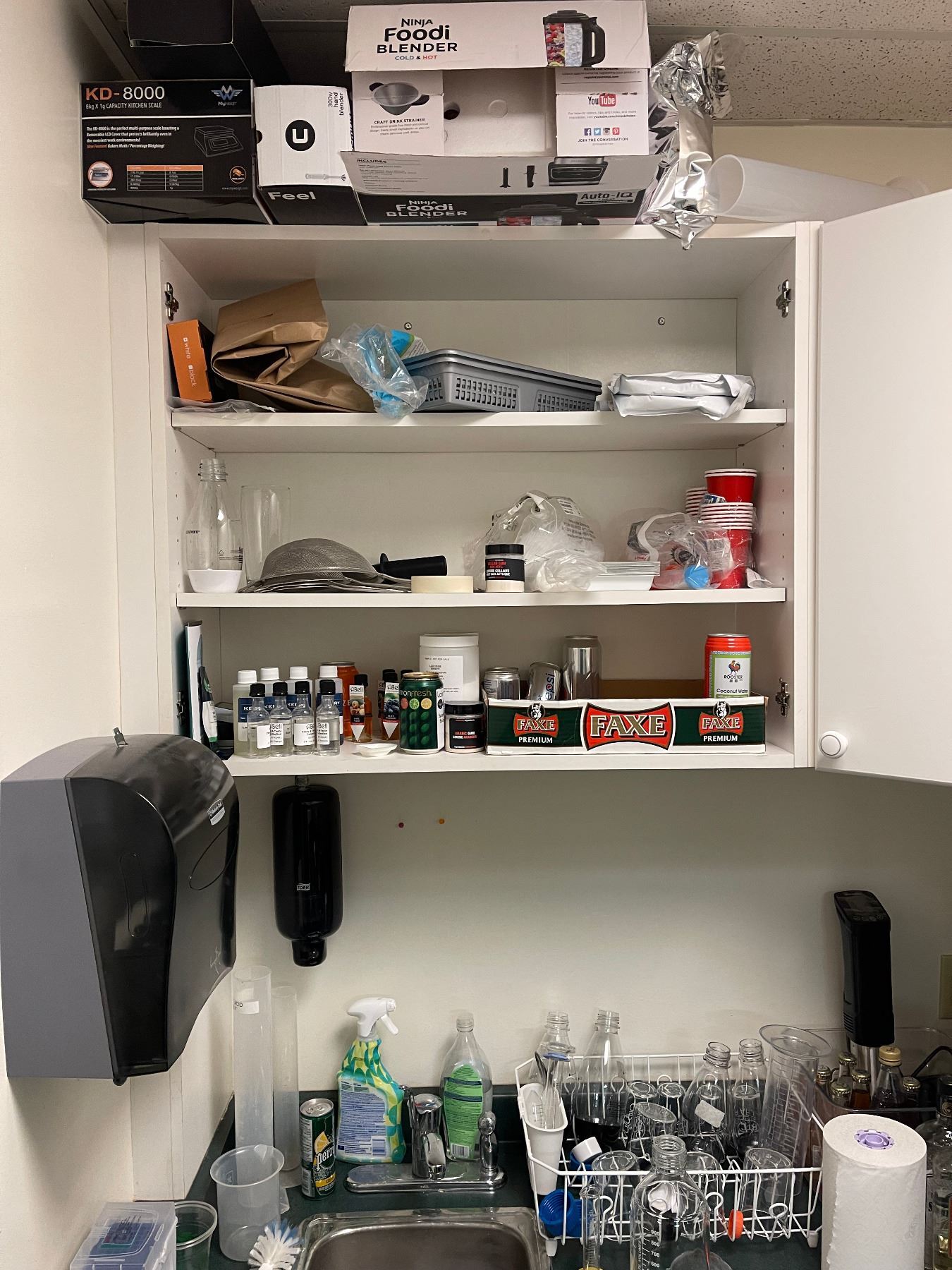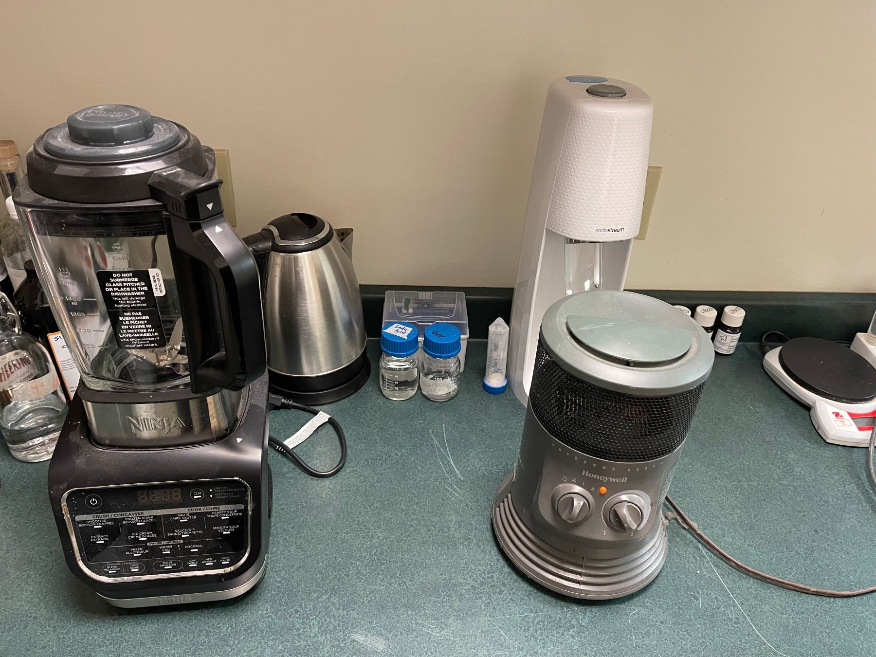 Group of misc. kitchen items - includes Ninja blender/ soda stream/ Honeywell room heater/ weigh scale/ cabinets full of assorted snacks (ALCOHOL NOT INCLUDED)