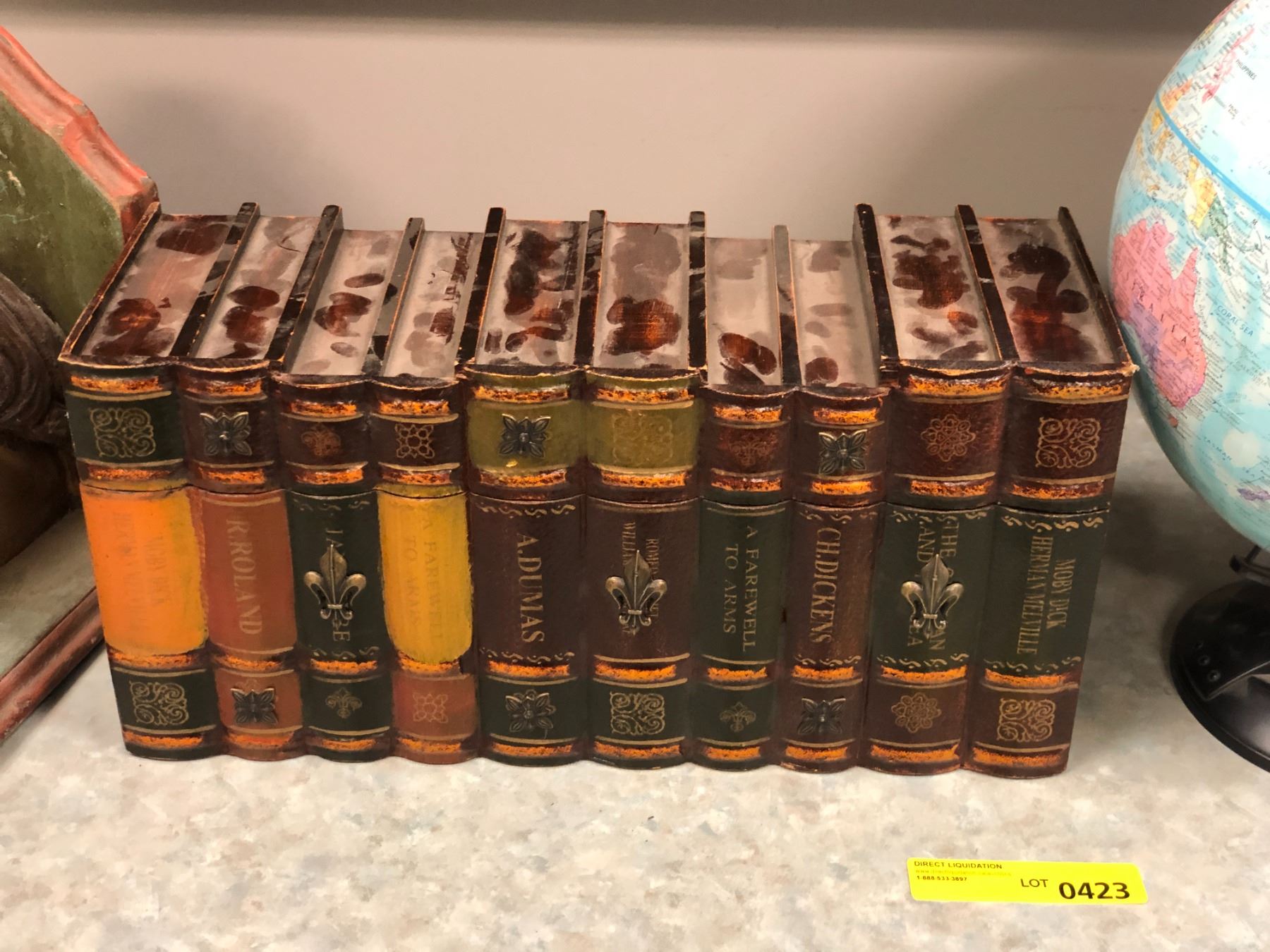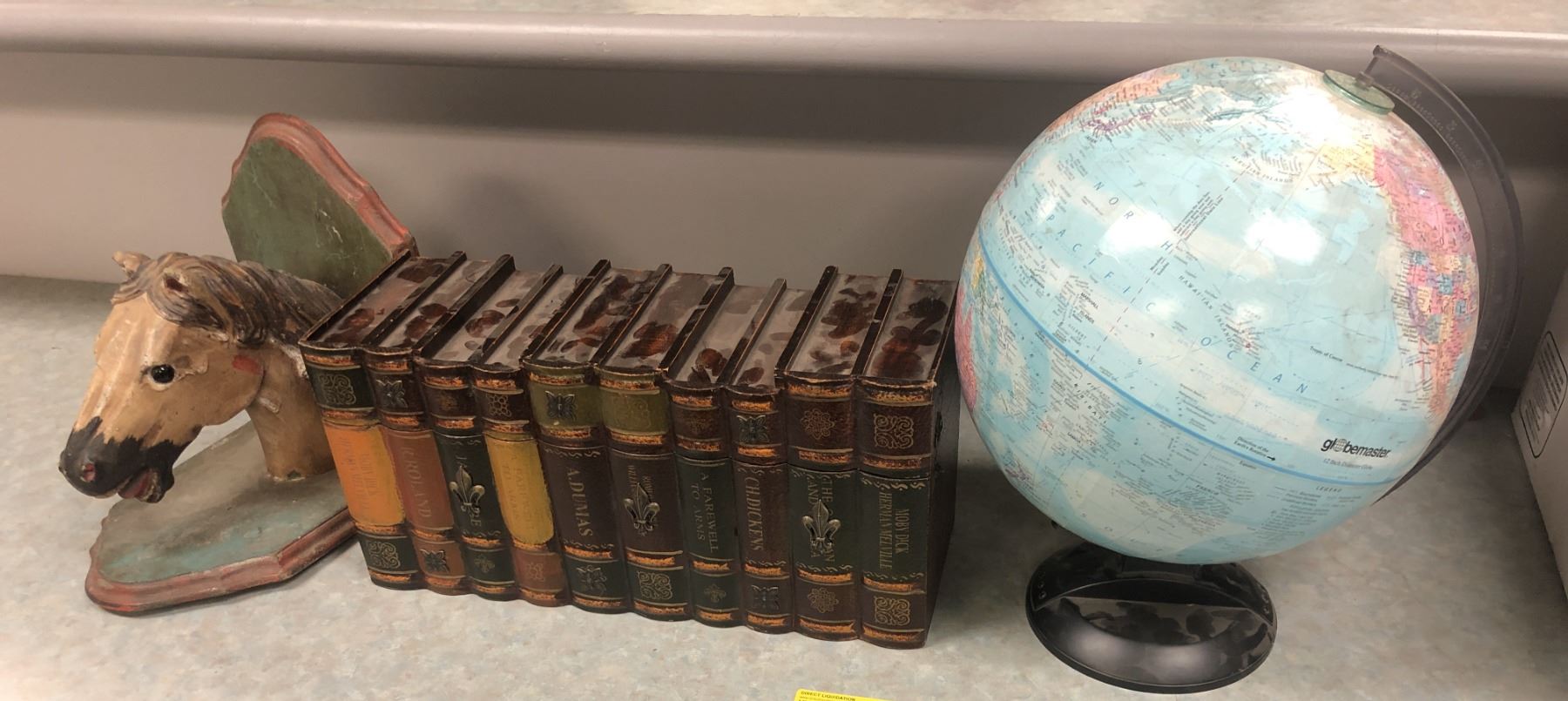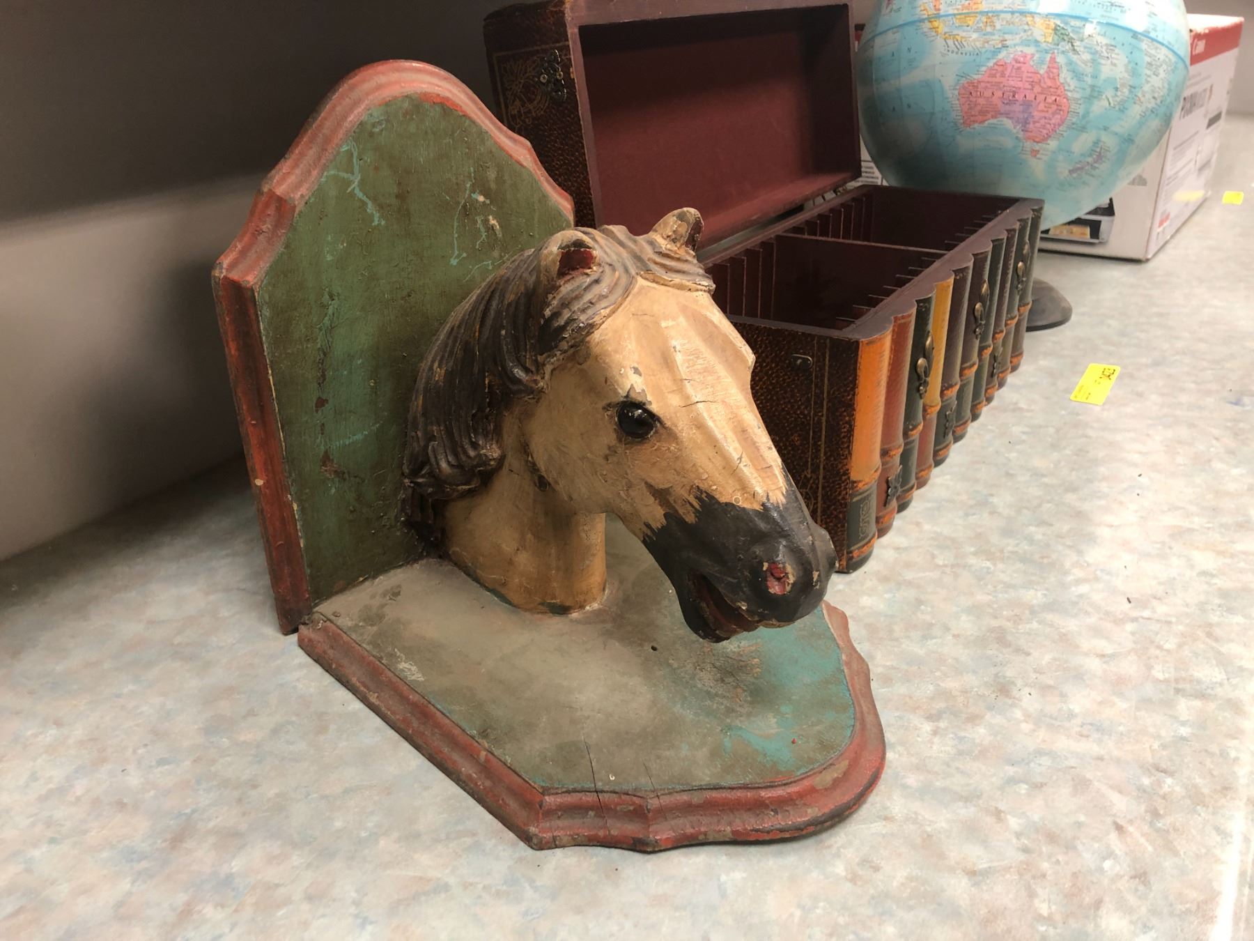 Group of misc. set dec items - includes globe/ wooden prop books box & vintage wooden horse head wall mount