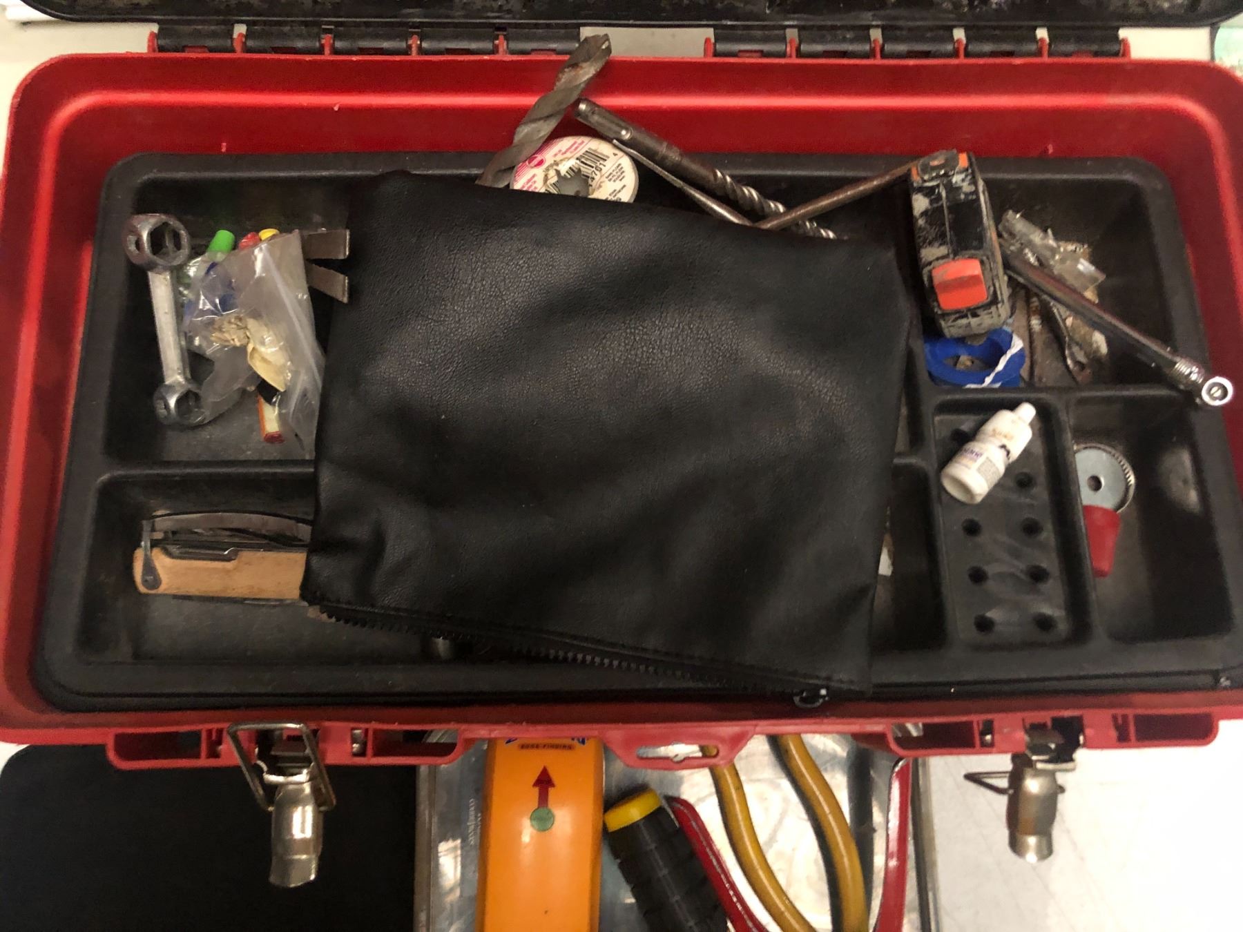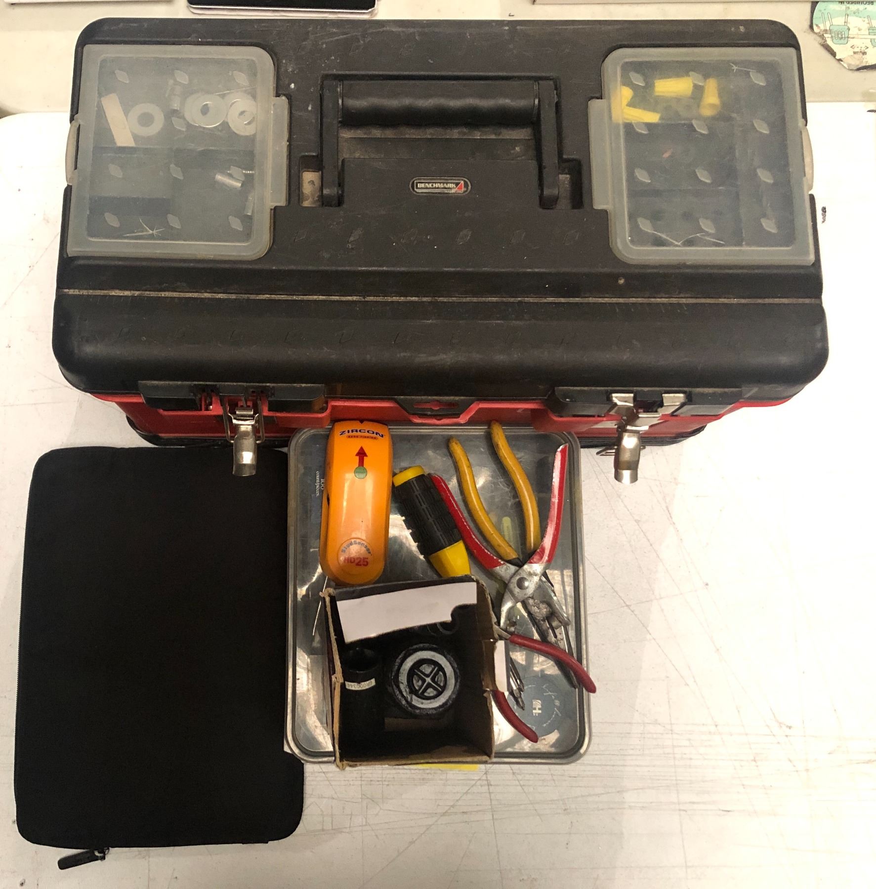 Group of misc tools including - toolbox, screwdriver, bottle jack, stud sensor, two-tone pliers, etc
