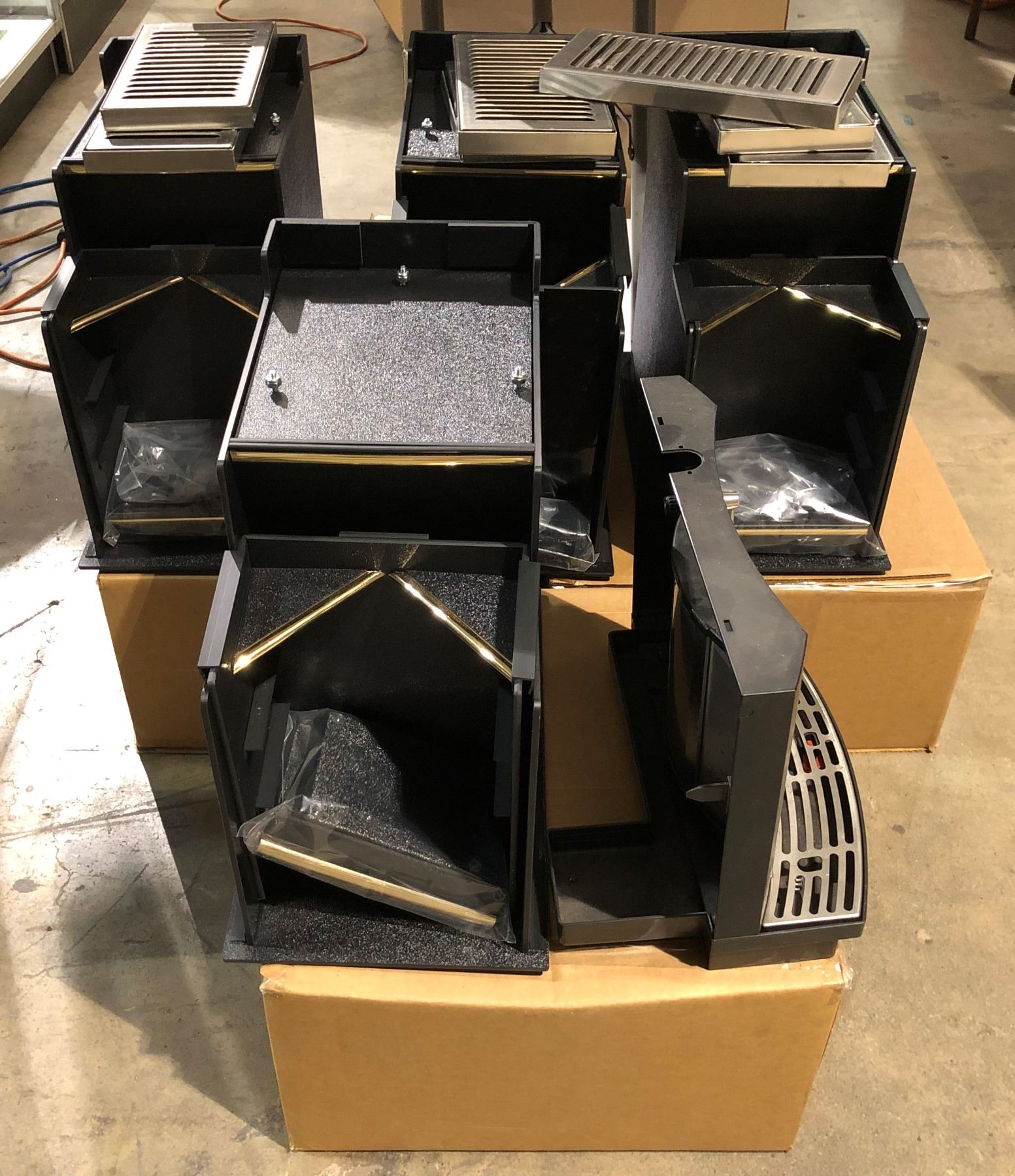 Group of new coffee shop coffee pot stands & assorted stainless steel drip pans