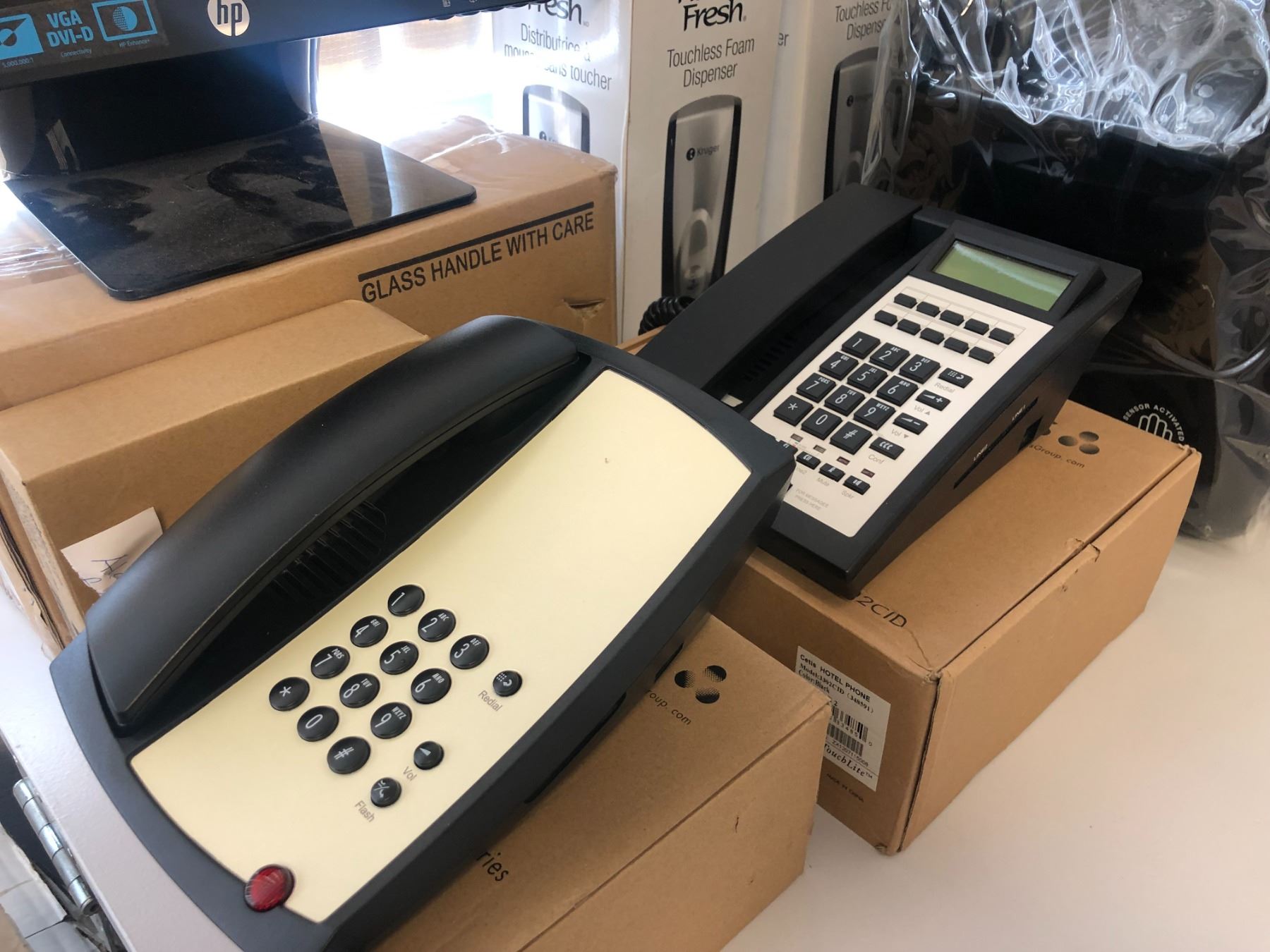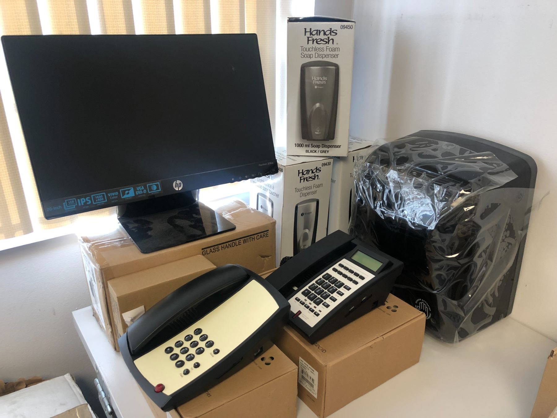 Group of new items - 3 touchless soap dispensers/ touchless paper towel dispenser/ 2 telephones/ HP monitor/ Bronze light fixture & answering machine