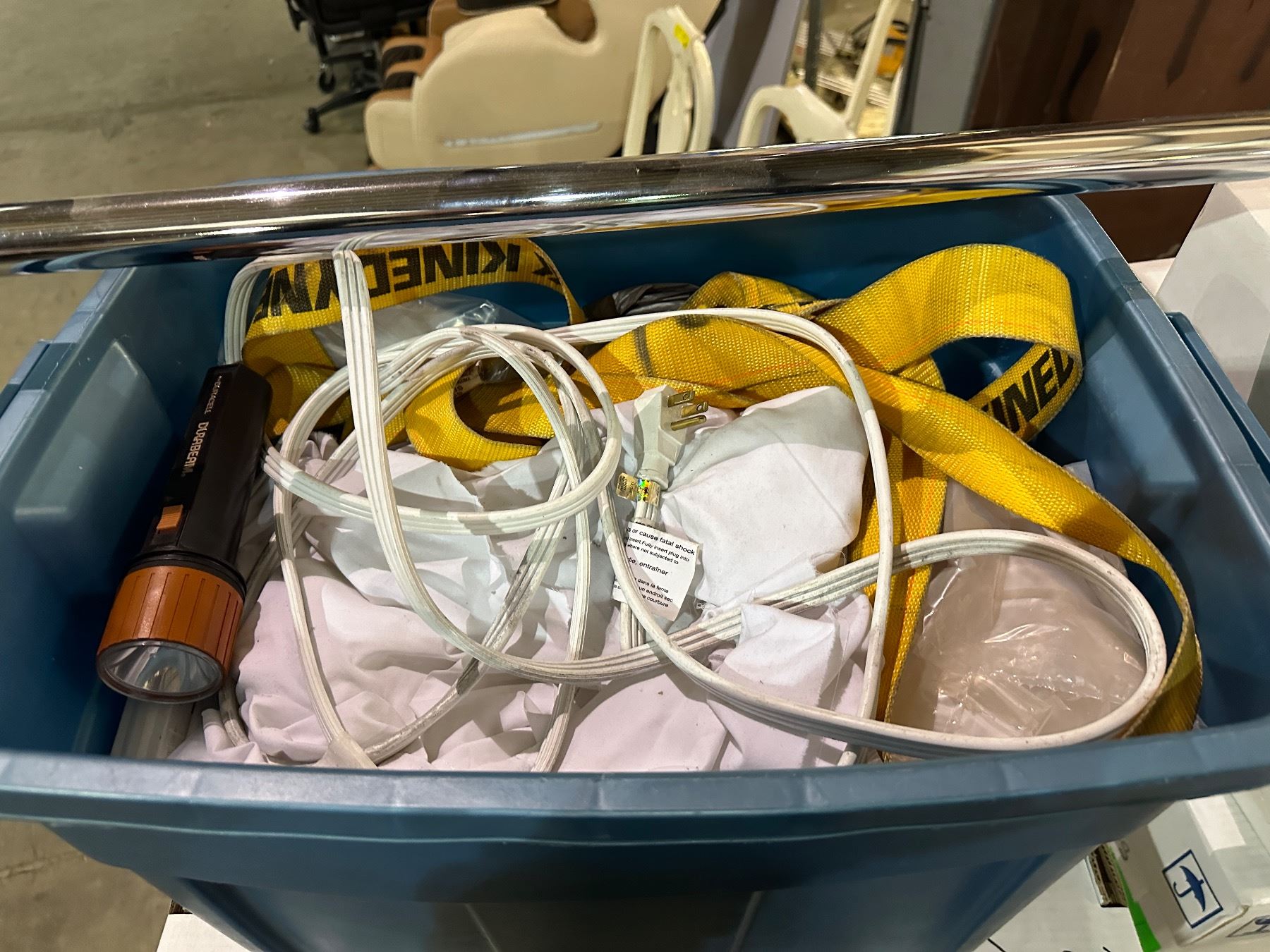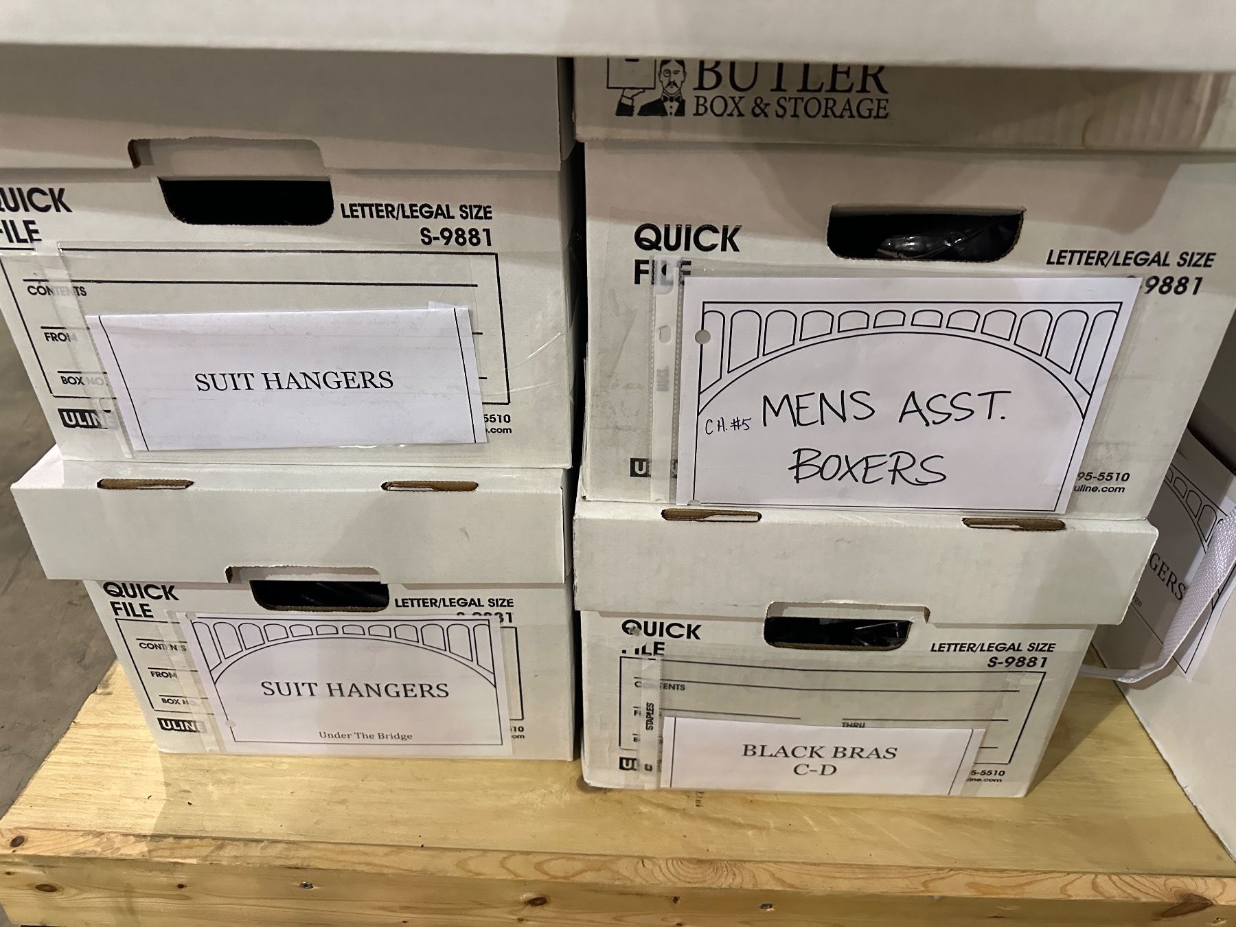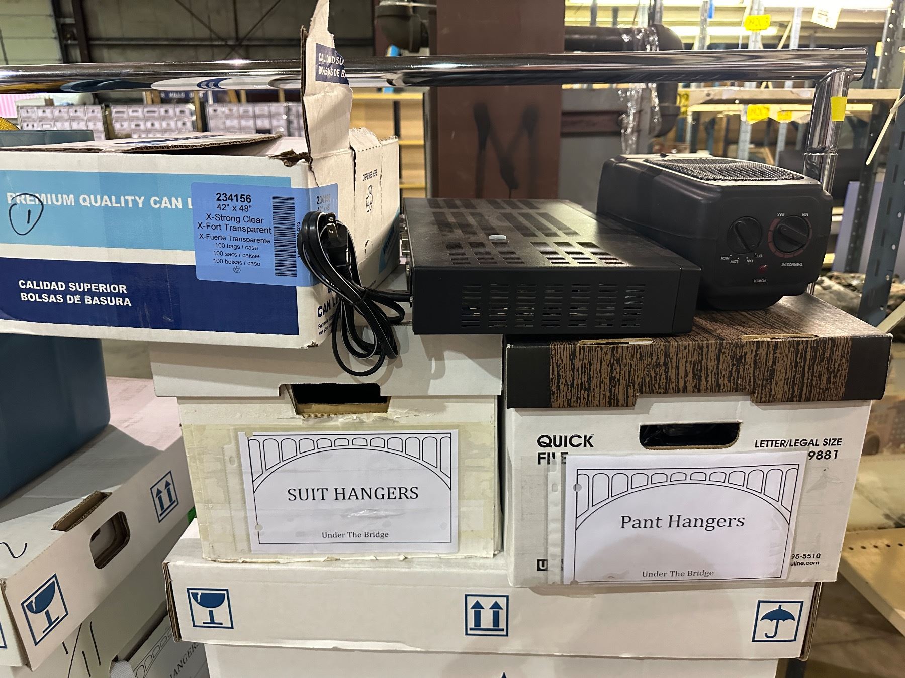 Group of set dec items including - men's boxers, suit hangers, black bras, misc electronics, pant hangers, etc...
