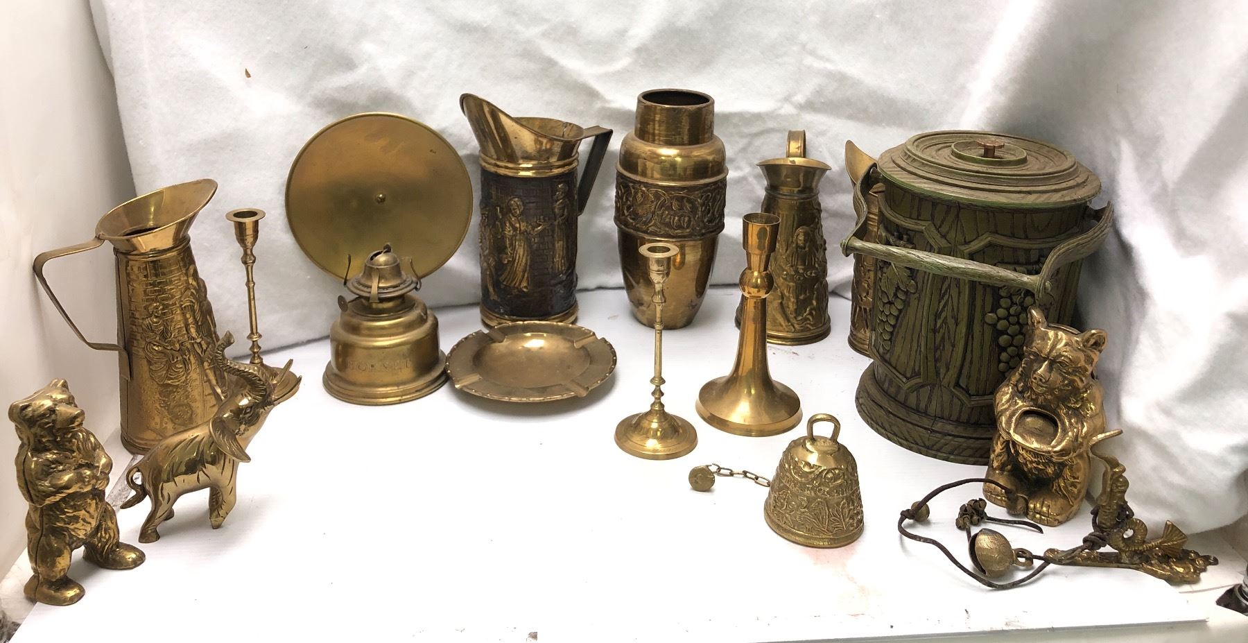 Group of vintage estate brass home decor - includes brass water jugs / oil lamp / brass bear figures etc