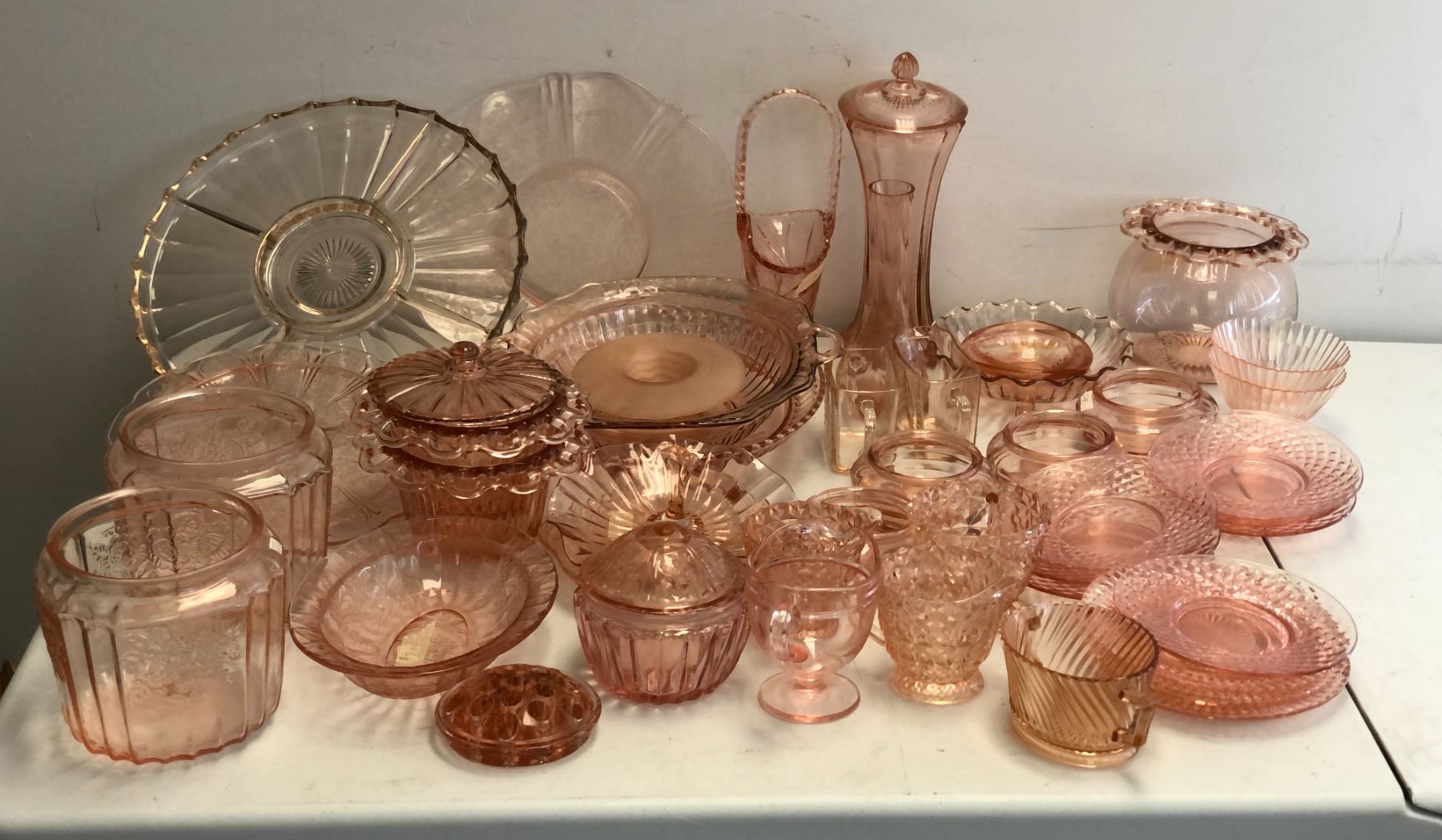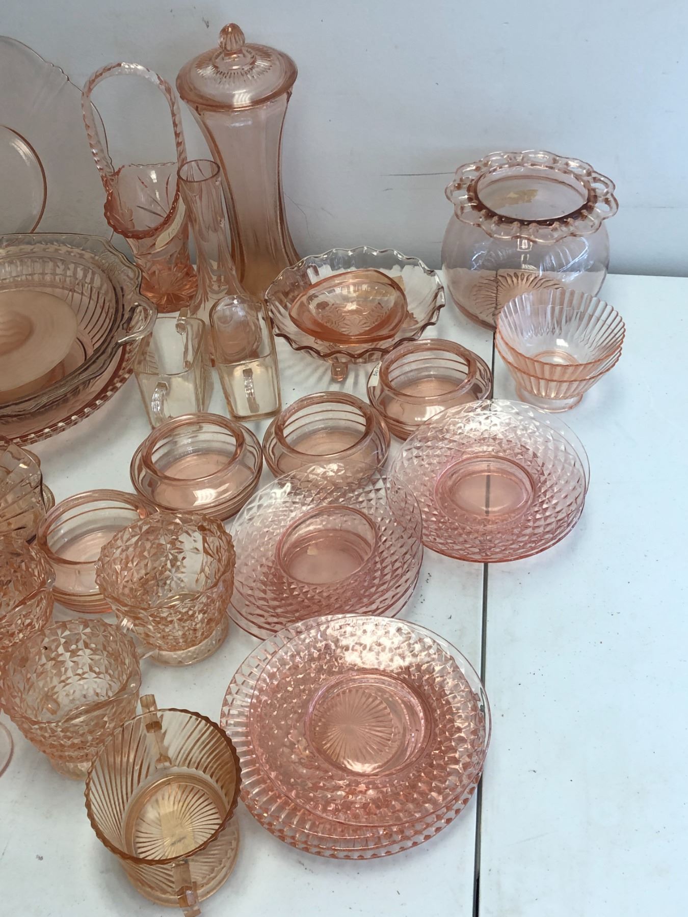 Group of vintage estate pink depression glass plates / bowls / platters / cups / saucers etc - approx 40 pcs