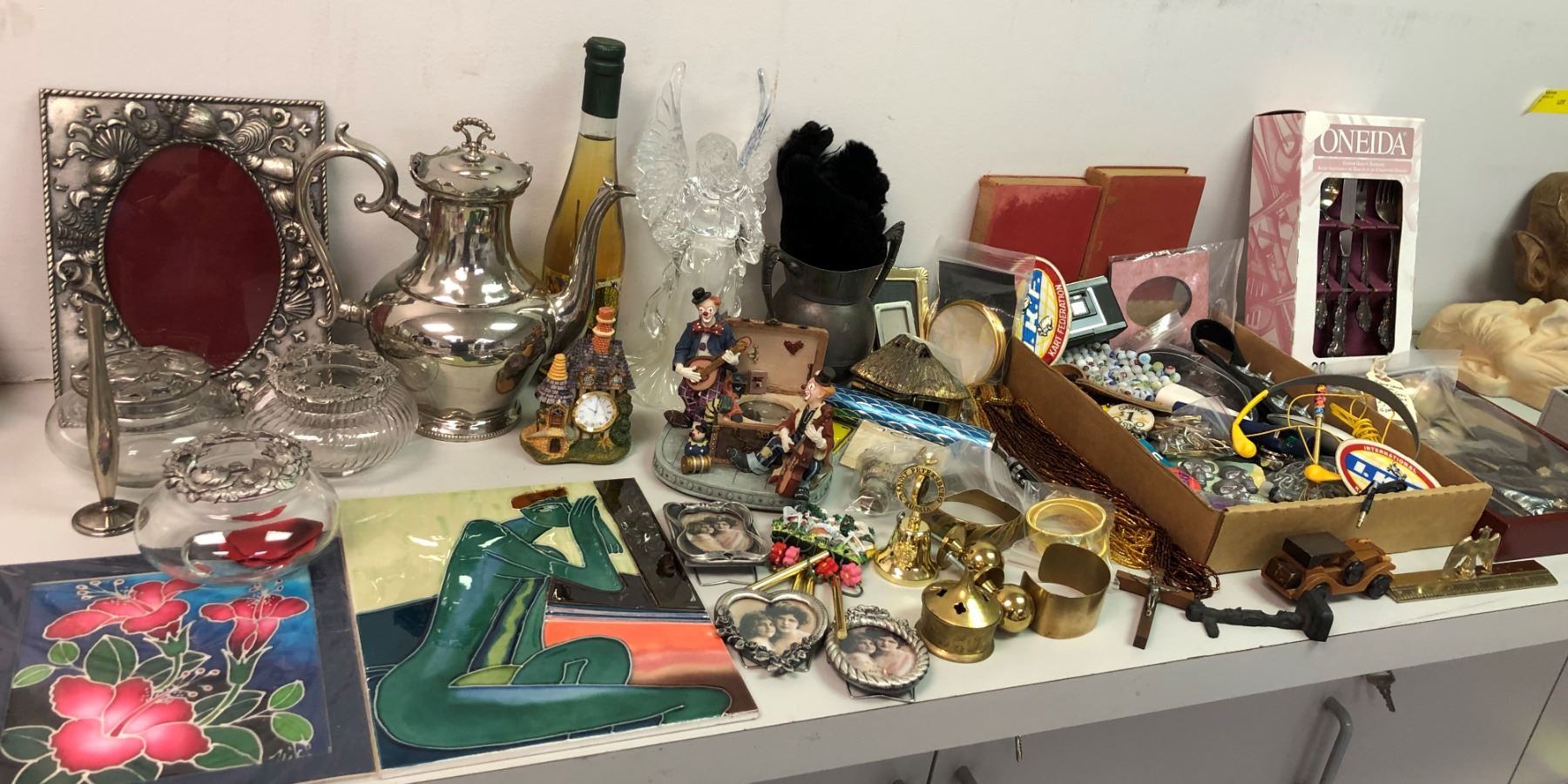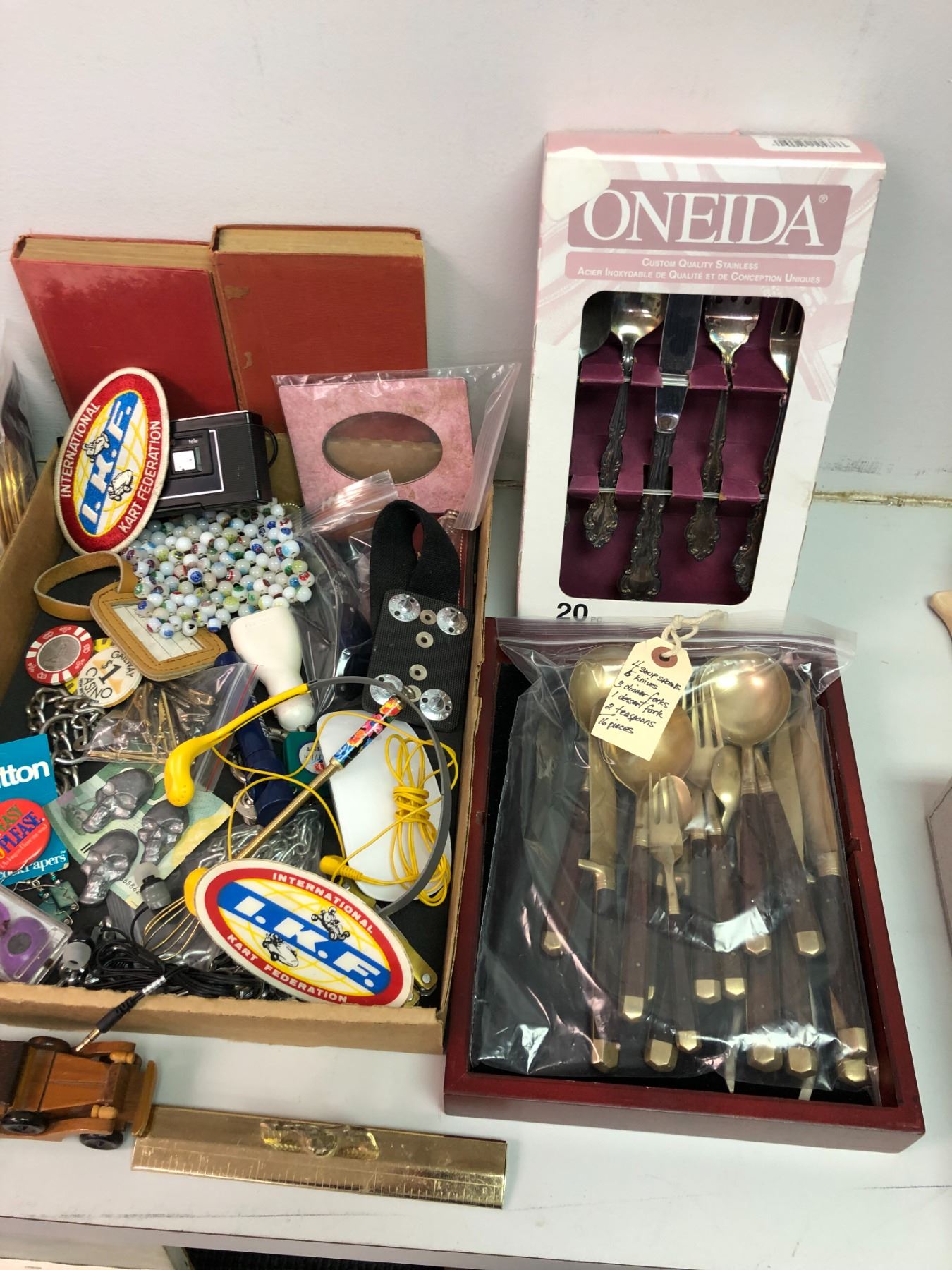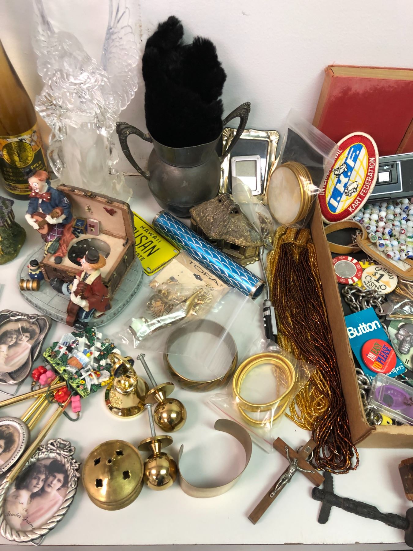 Group of vintage glassware/ brass decorative items/ silver jar/ utensils etc.
