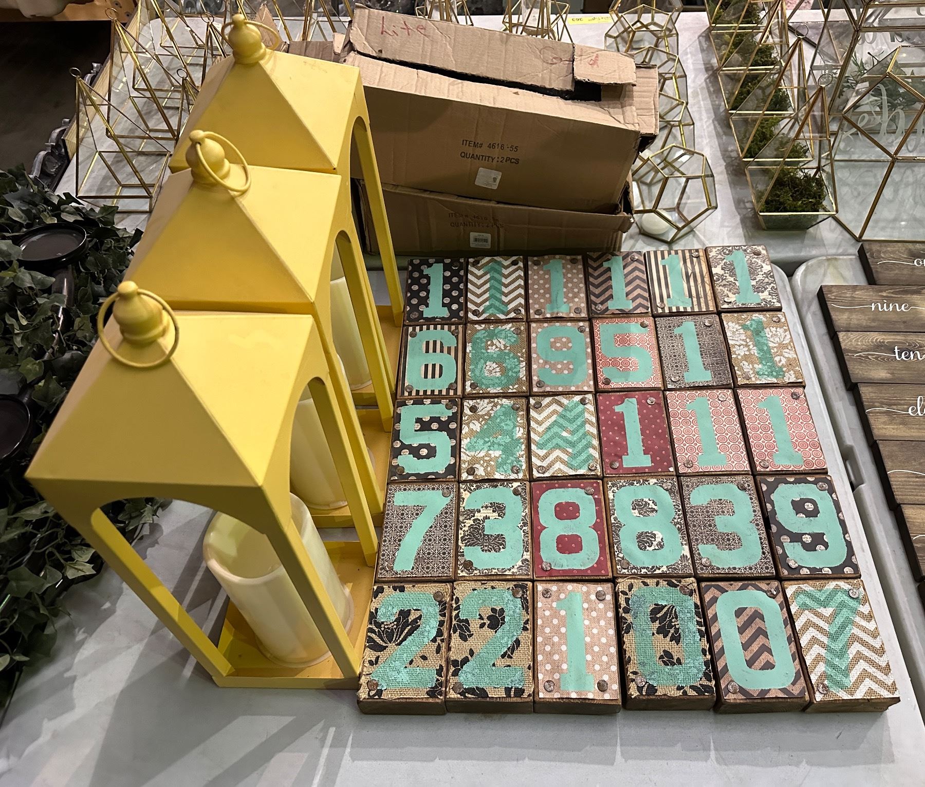 Group of wedding decor including - table numbers, candle lantern holders, etc....