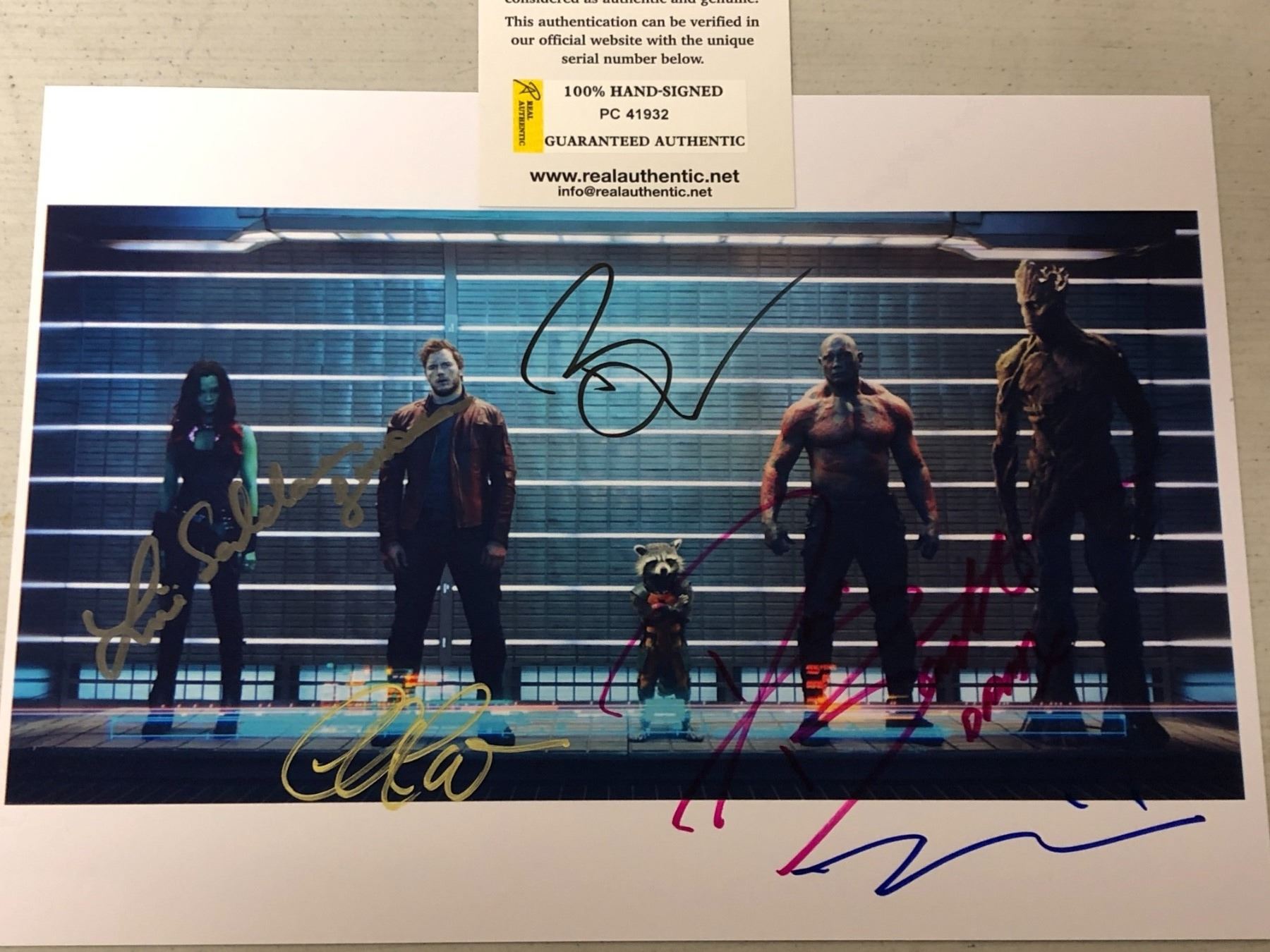 "Guardians of the Galaxy" - Cover Print Signed by Cast w/COA from Real Authentic - includes autographs of Chris Pratt/Dave Bautista/Vin Diesel/Bradley Cooper & Zoe Saldana