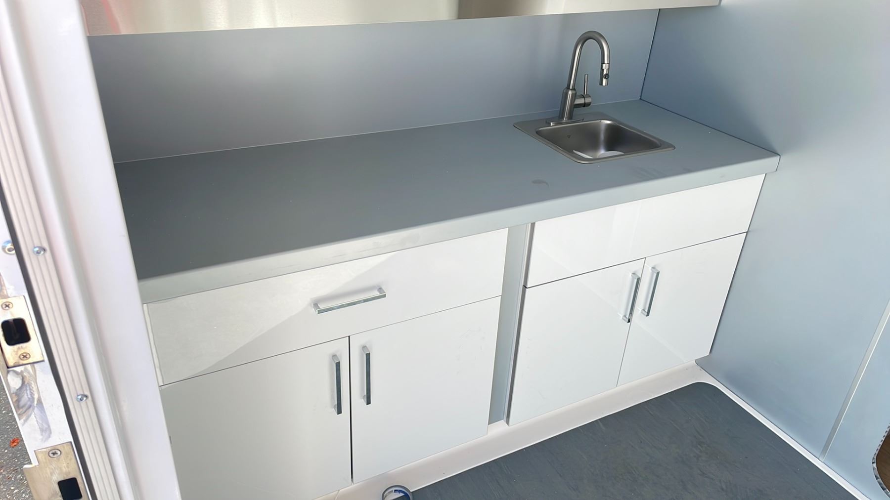*H/T S* GREY 40' 67,200 LBS MAX CAPACITY INDUSTRIAL HORTICULTURAL GROW / STERILE LABORATORY TRANSPORT CONTAINER WITH MAN DOOR, RUN FOR POWER / NETWORK, BREAKER BOX, VENTILATION, HAND WASH SINK / STORAGE CABINETS / COUNTER, RUFFED IN FOR GRATED FLOOR * REQUIRES AIR HANDLER FOR VENTILATION