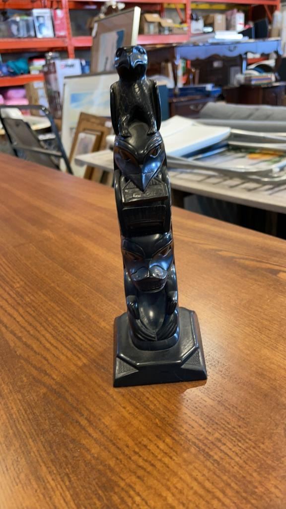 HAIDA TOTEM POLE CARVING BY RUFUS MOODY - SIGNED ON BOTTOM, ARGILLITE TOTEM 8 1/2 INCHES TALL, REPLA