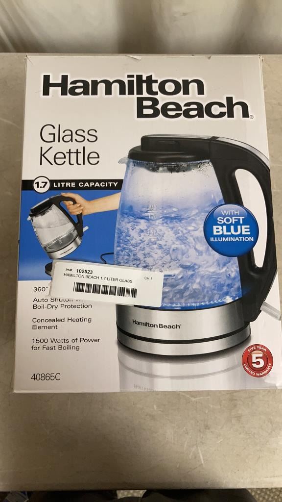 HAMILTON BEACH 1.7 LITER GLASS ELECTRIC KETTLE - TESTED WORKING, RETAIL $59