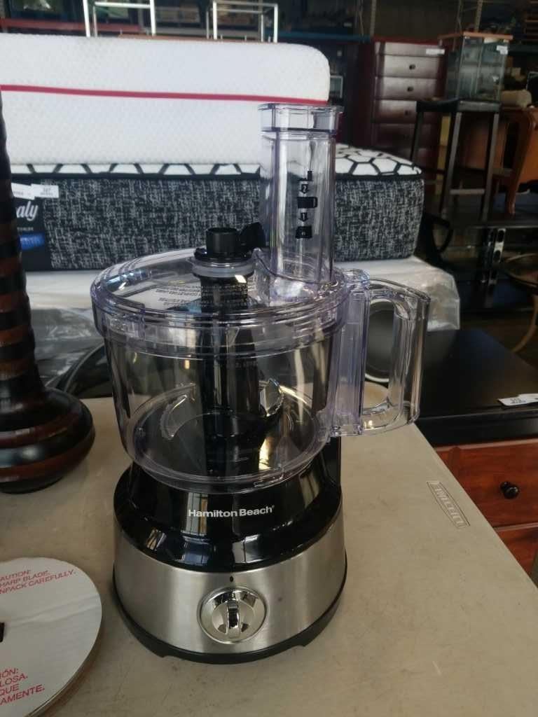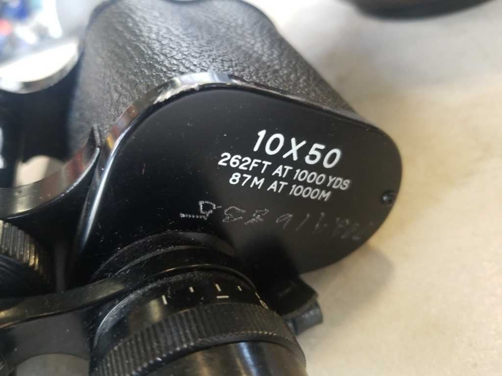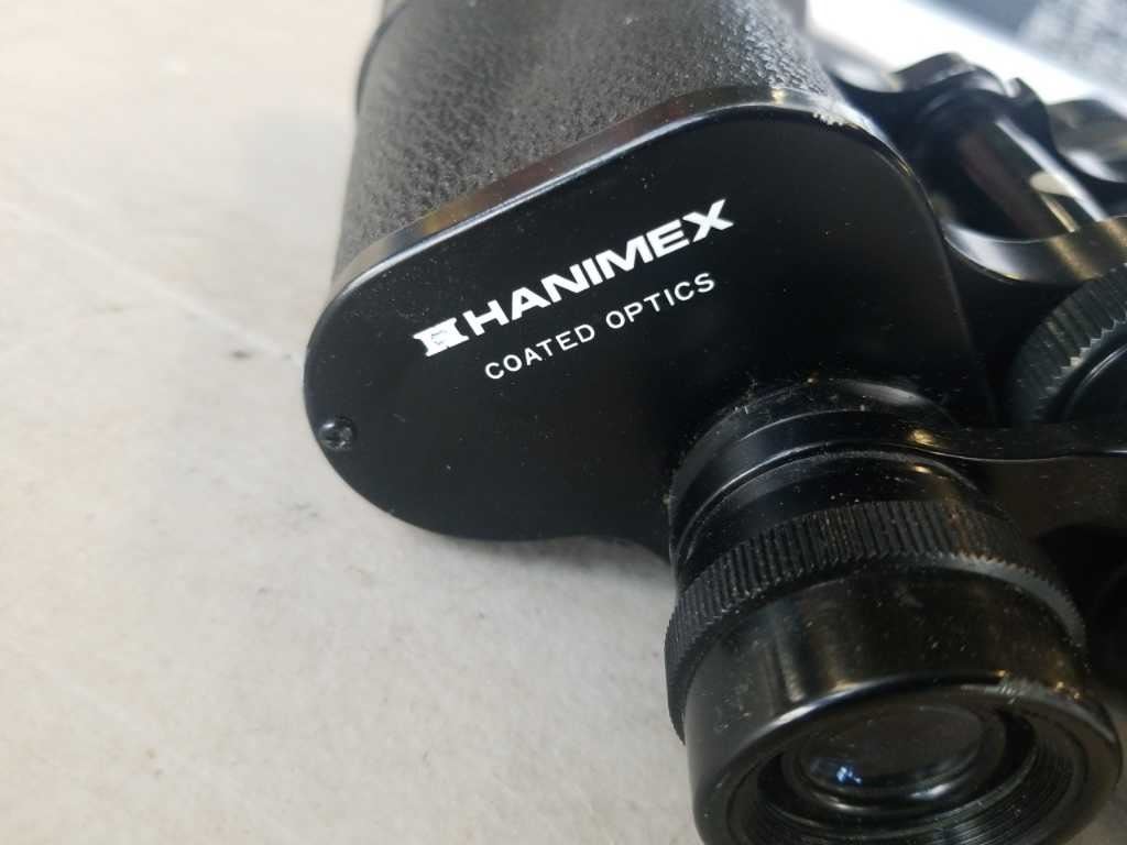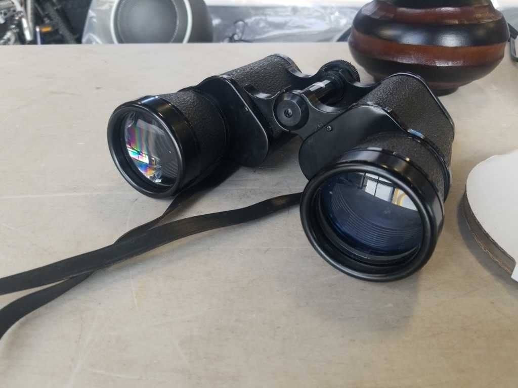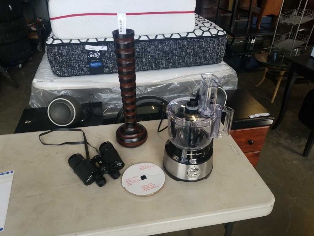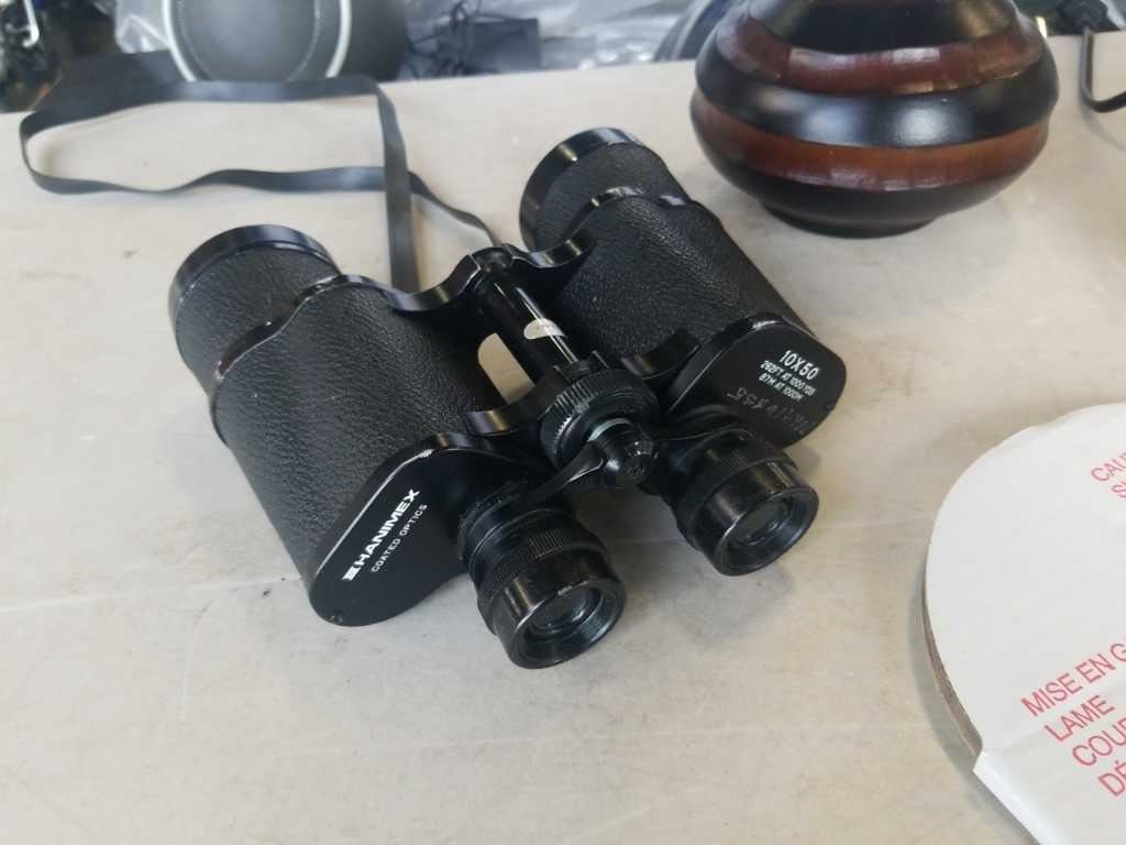 HAMILTON BEACH FOOD PROCESSOR, HANIMEX 10X50 BINOCULARS AND WOOD VASE