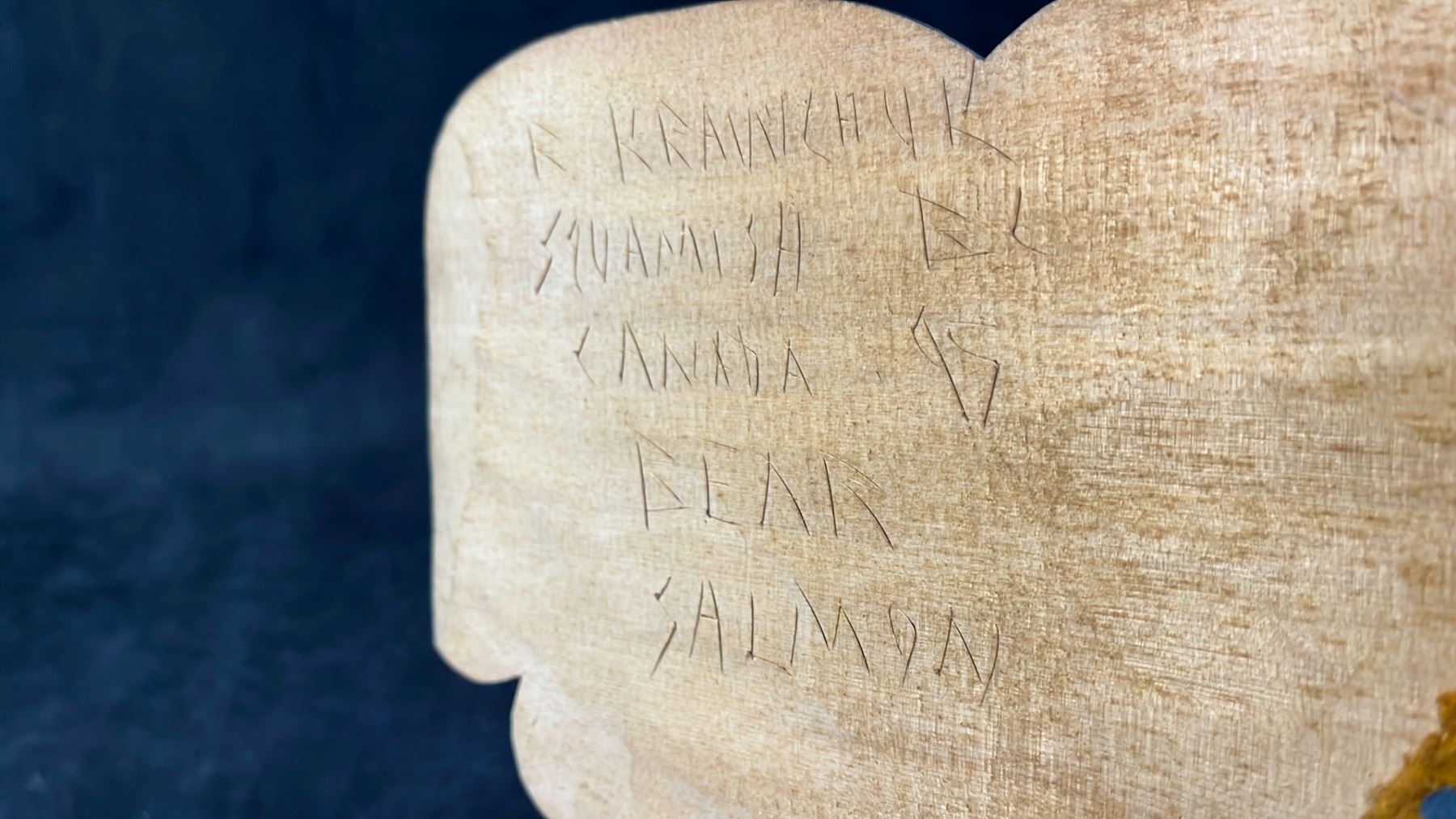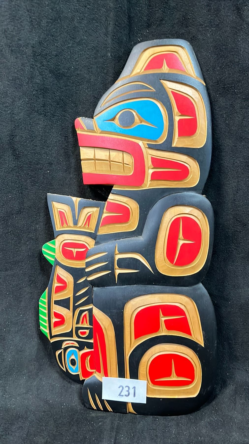 HAND CARVED FIRST NATIONS PLAQUE BY RICHARD KRAWCHUCK TITLED "BEAR & SALMON" 12" X 6"