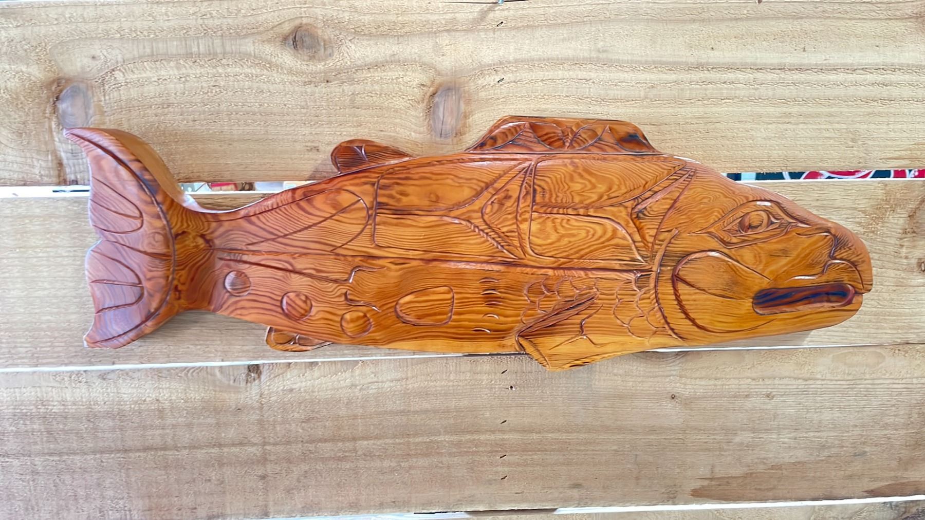 HAND CARVED FIRST NATIONS SALMON BY JIM HARRIS 23" X 8"