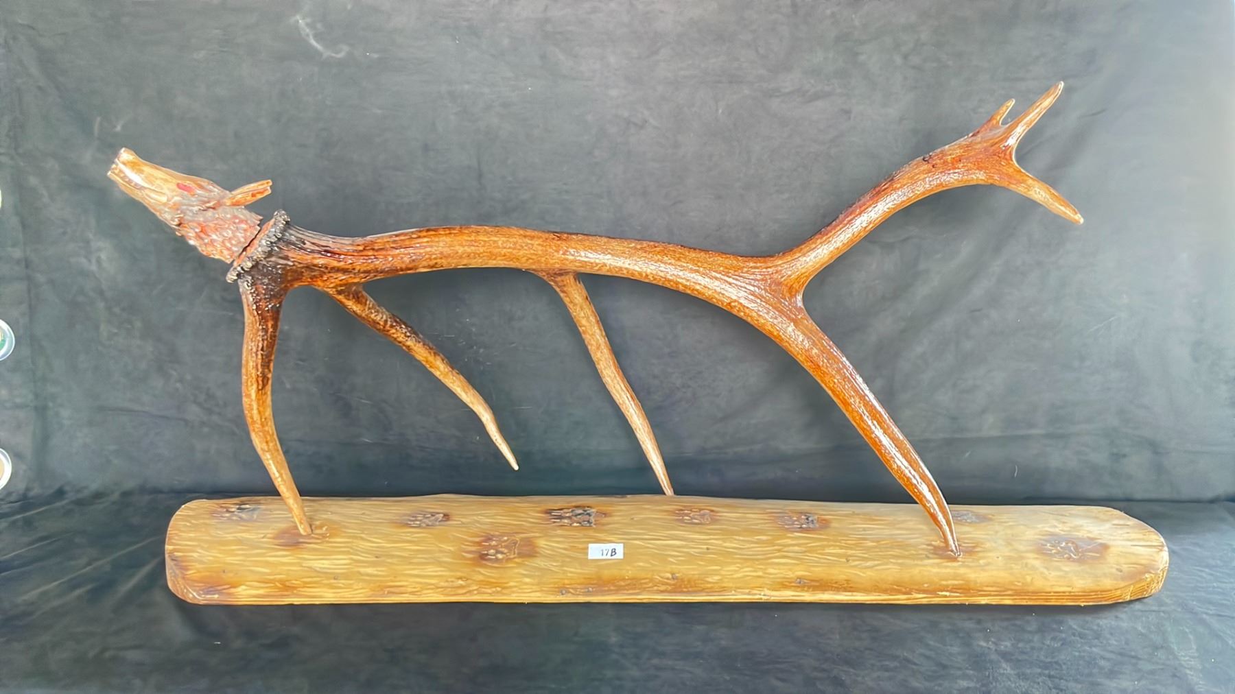 HAND CARVED FIRST NATIONS WOLF CARVED INTO ELK ANTLER ON CEDAR BASE BY CREE ARTIST DUANO GOULET 42" X10" X 20"