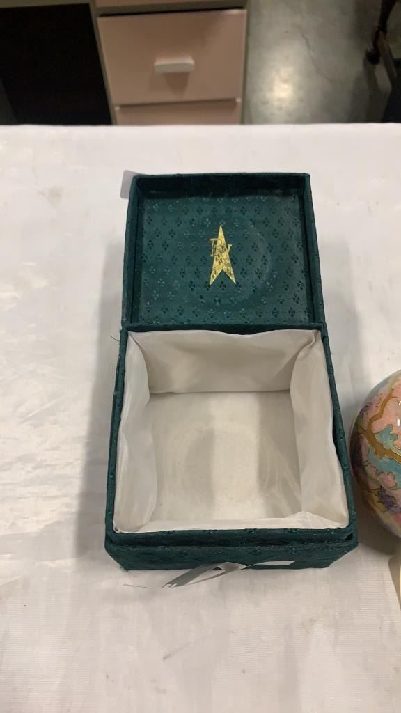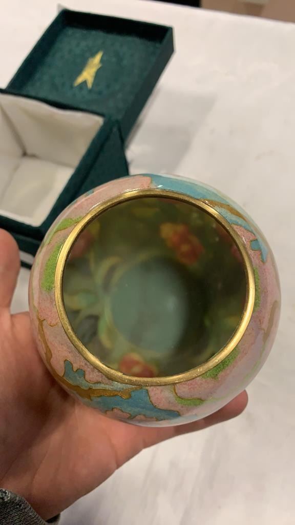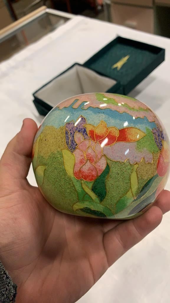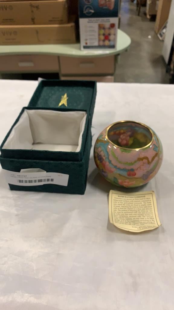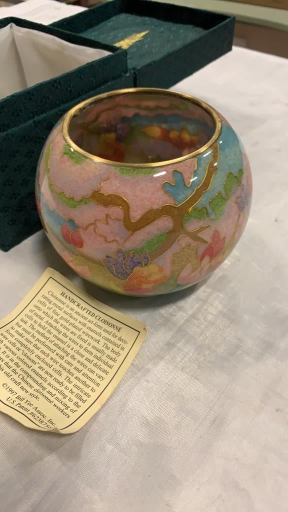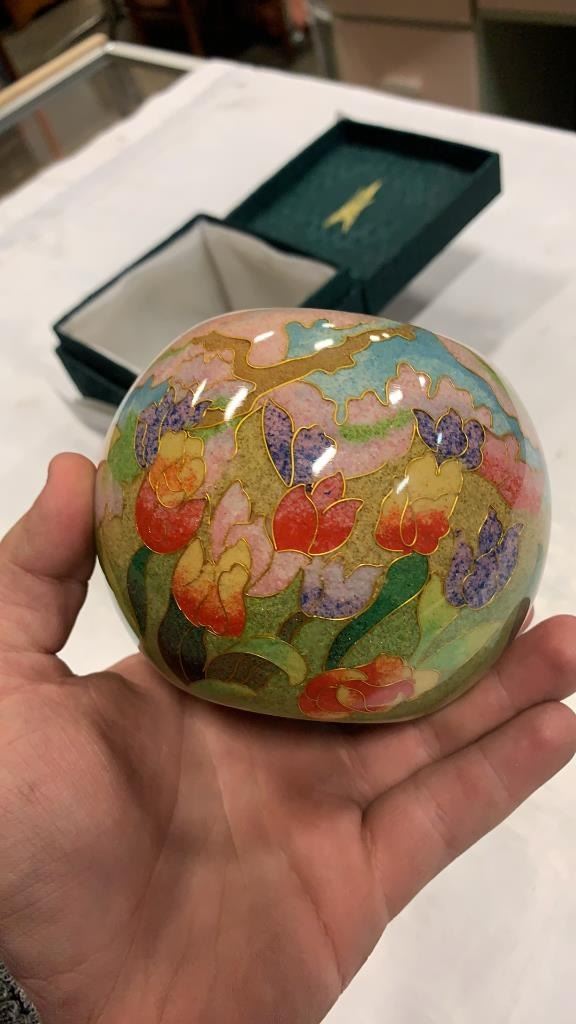 HAND CRAFTED GLASS CLOISONNE APPROX 3 INCHES TALL, 4.5 INCHES WIDE