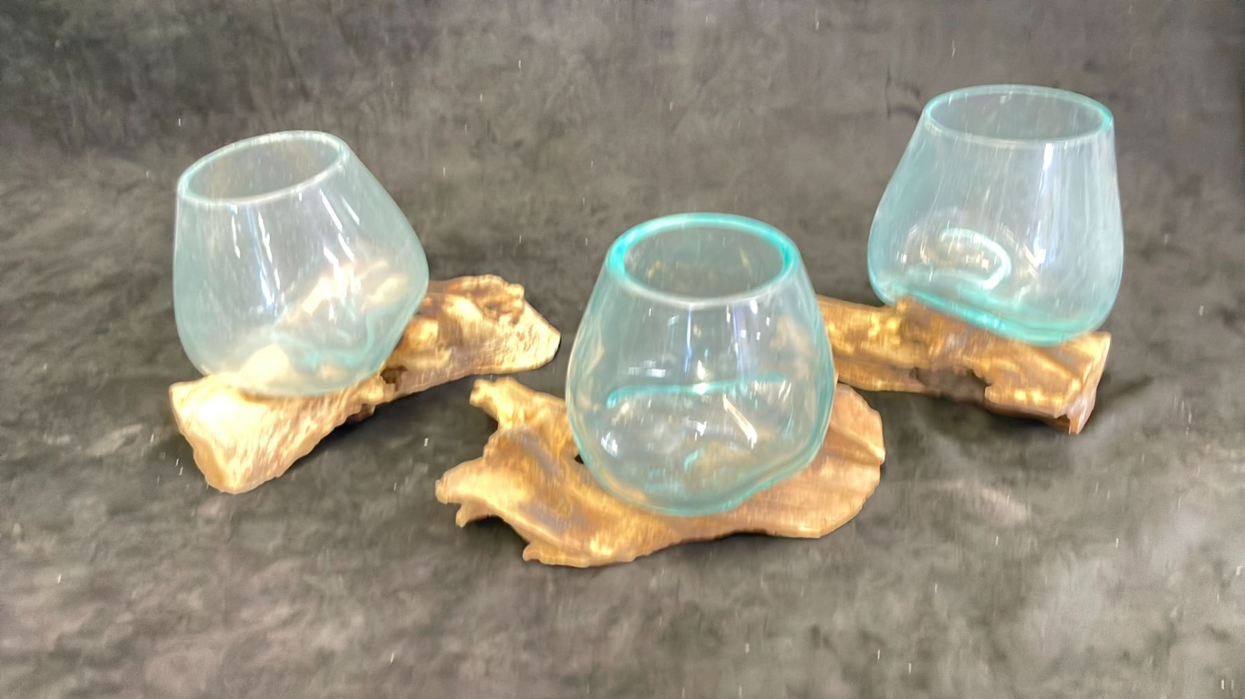 HAND MADE MOLTEN GLASS BOWLS ON TEAK BASES