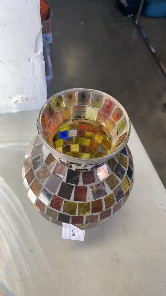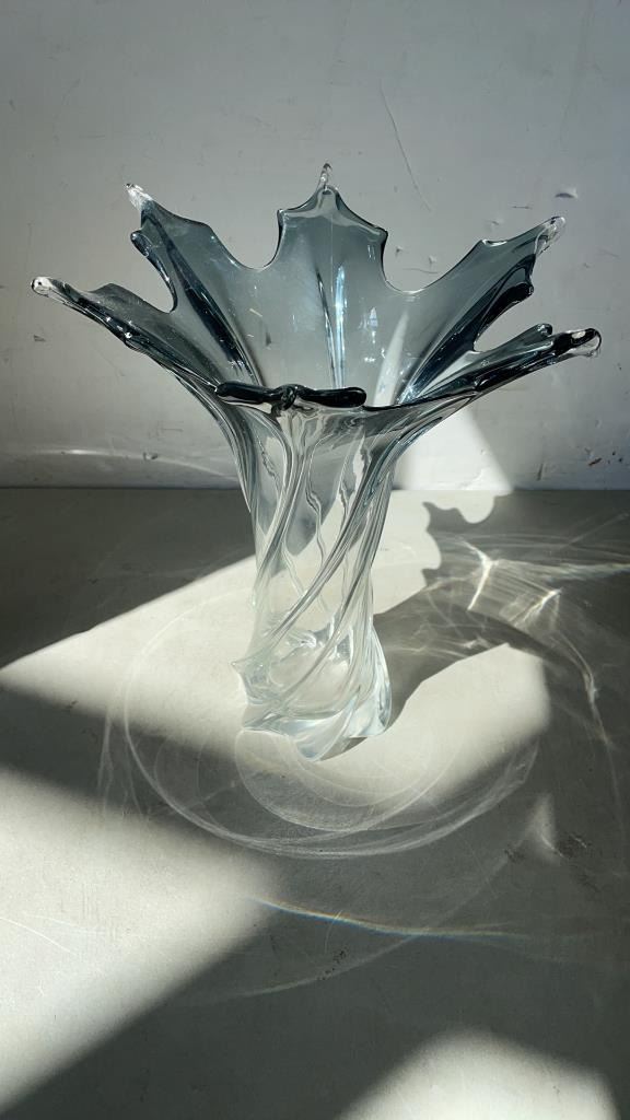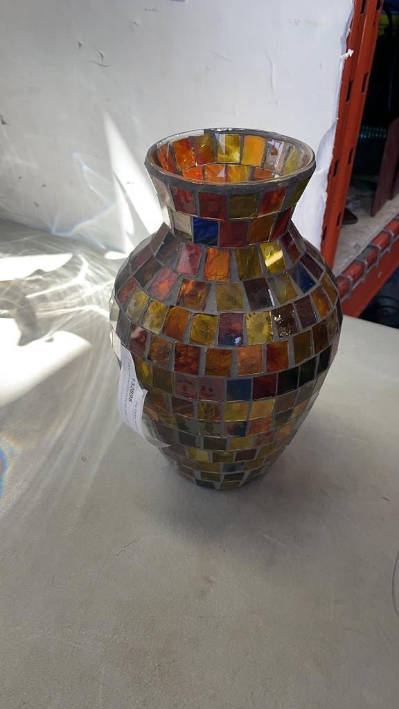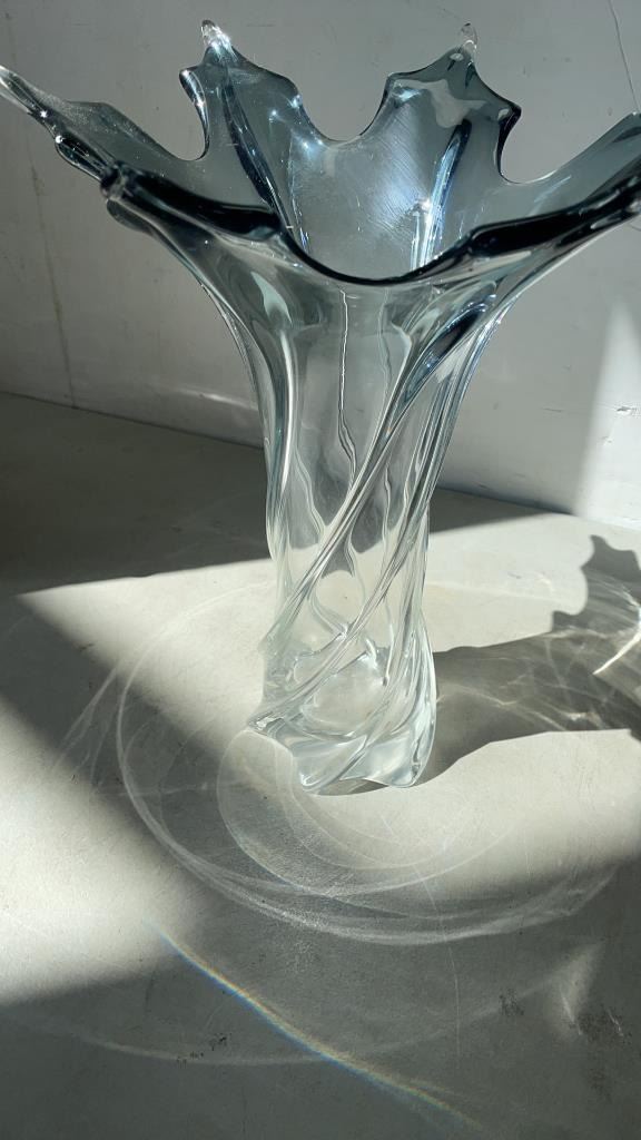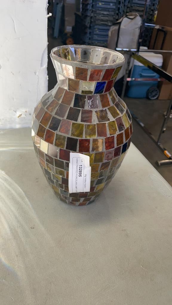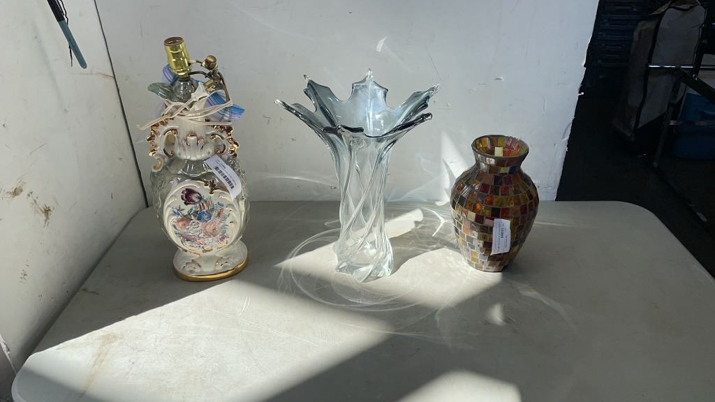 HAND PAINTED PORCELAIN LAMP, PLANEL GLASS VASE AND CRYSTAL VASE