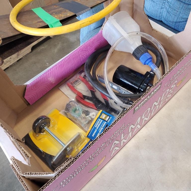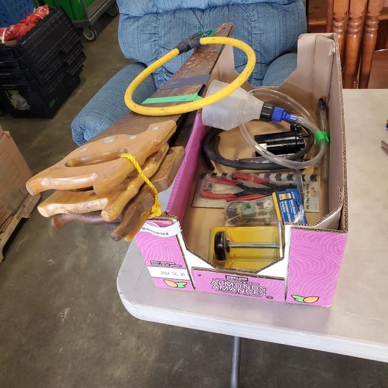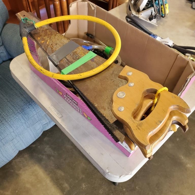 HAND SAWS AND TRAY OF TOOLS, HOSES, ETC