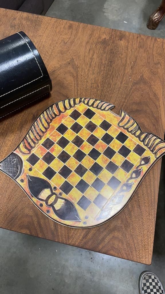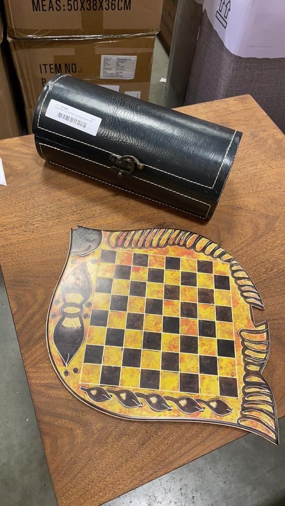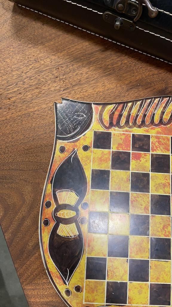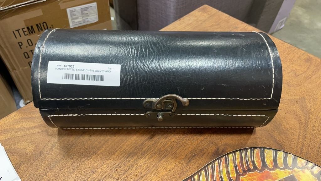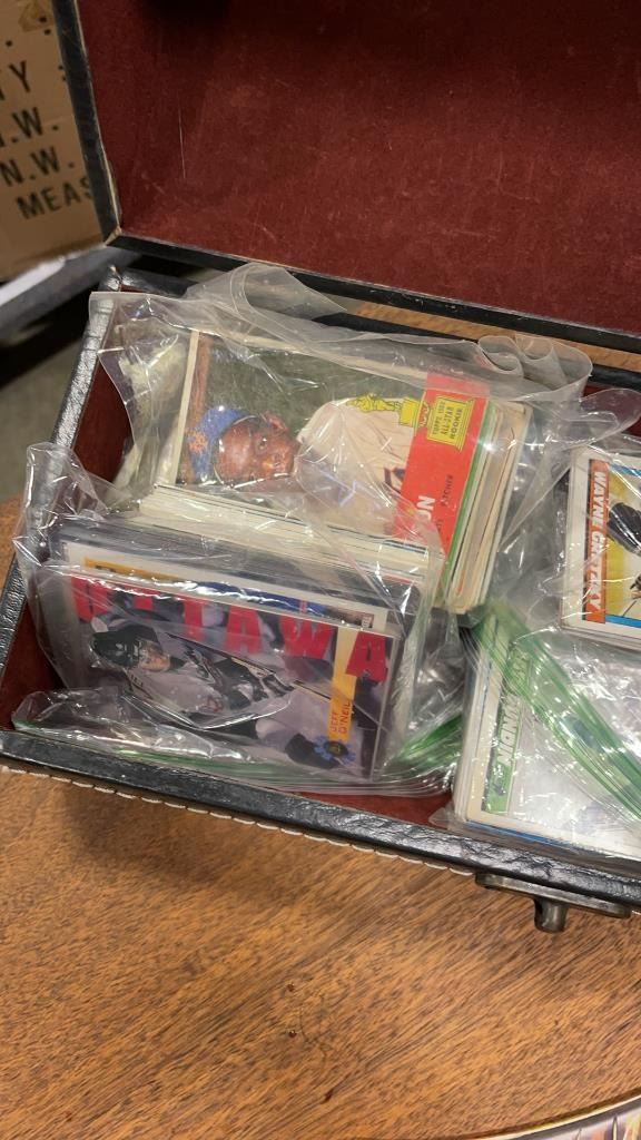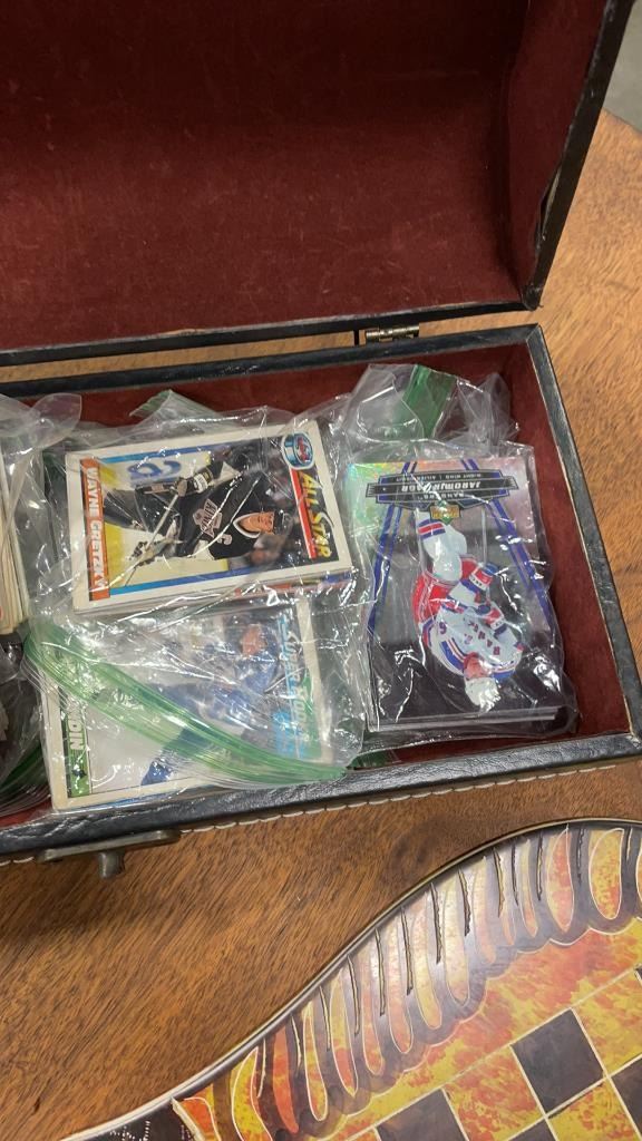 HANDCRAFTED STONE CHESS BOARD AND LEATHER CASE FULL OF SPORTS CARDS