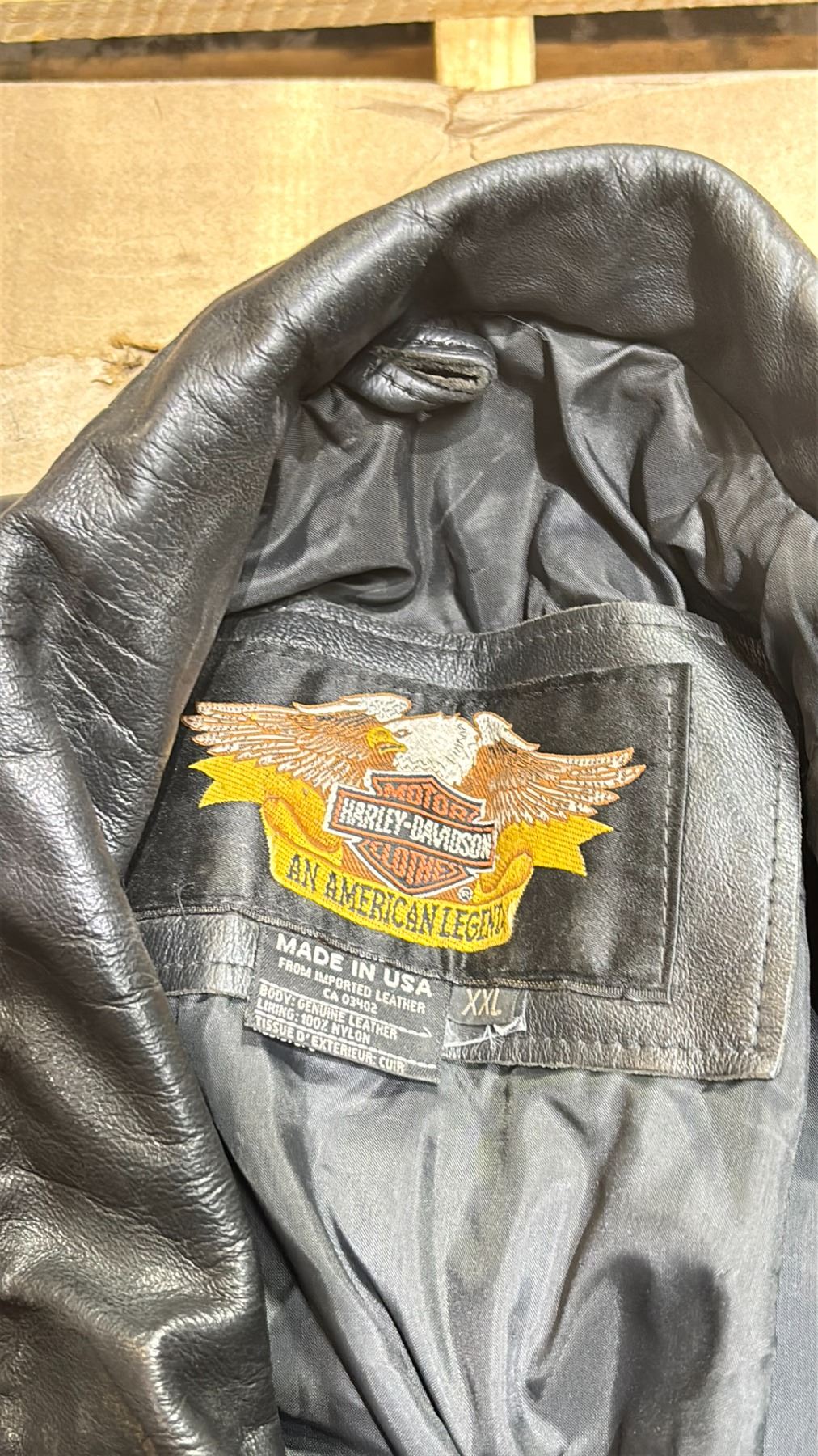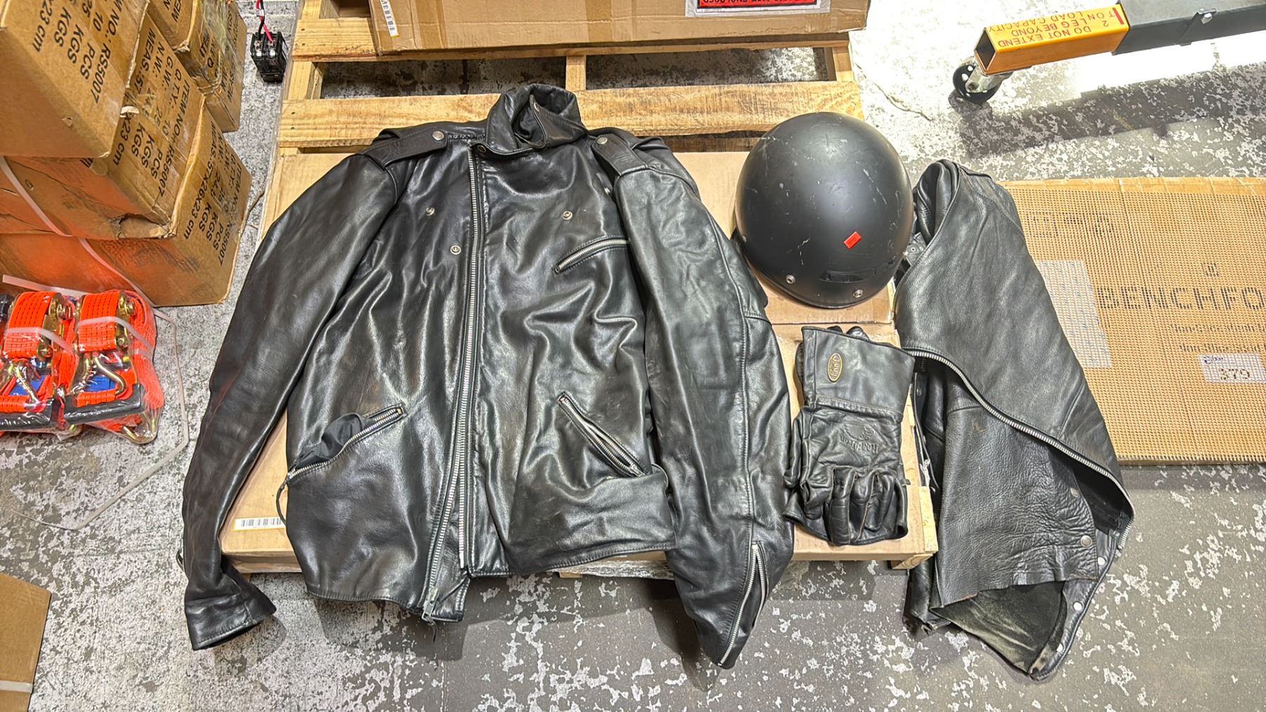 HARLEY DAVIDSON LEATHER JACKET XXL + RIDING GEAR, INCLUDES JIMMY ROAD IRON GLOVES, HELMET
