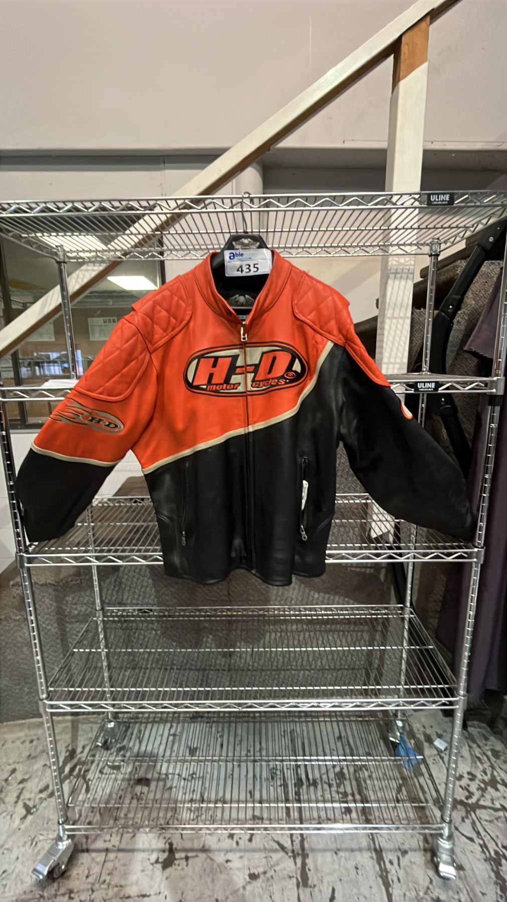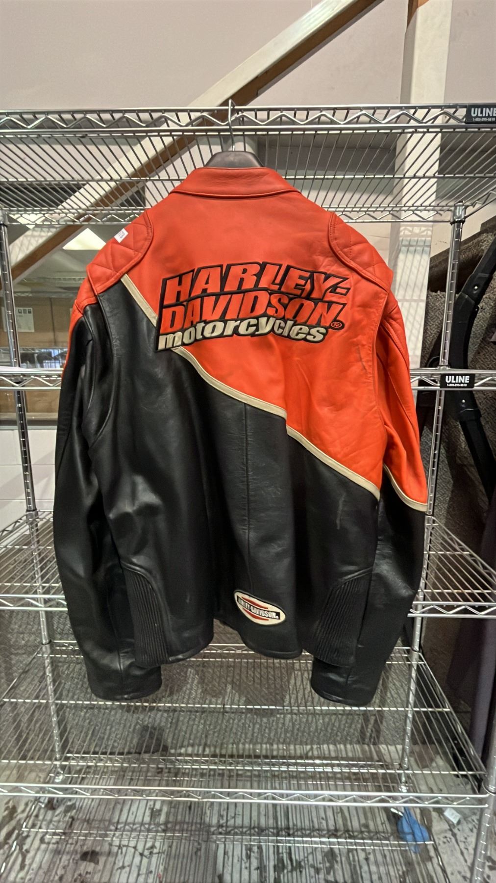 HARLEY DAVIDSON RACING ORANGE & BLACK LEATHER JACKET - SIZE UNKNOWN