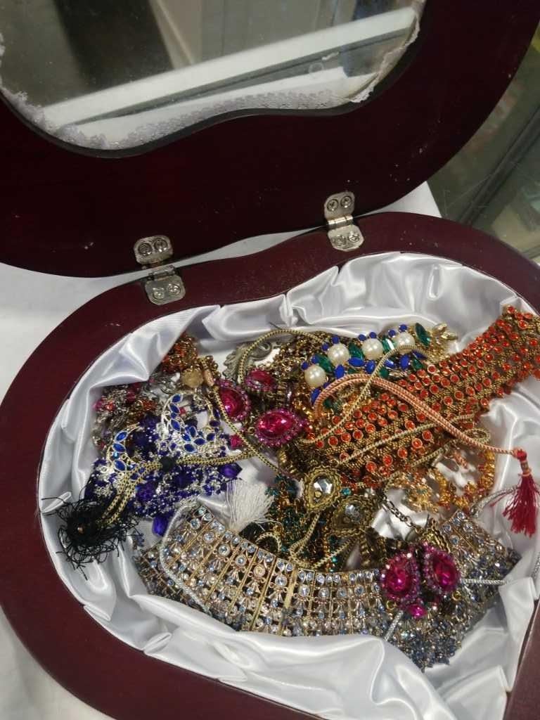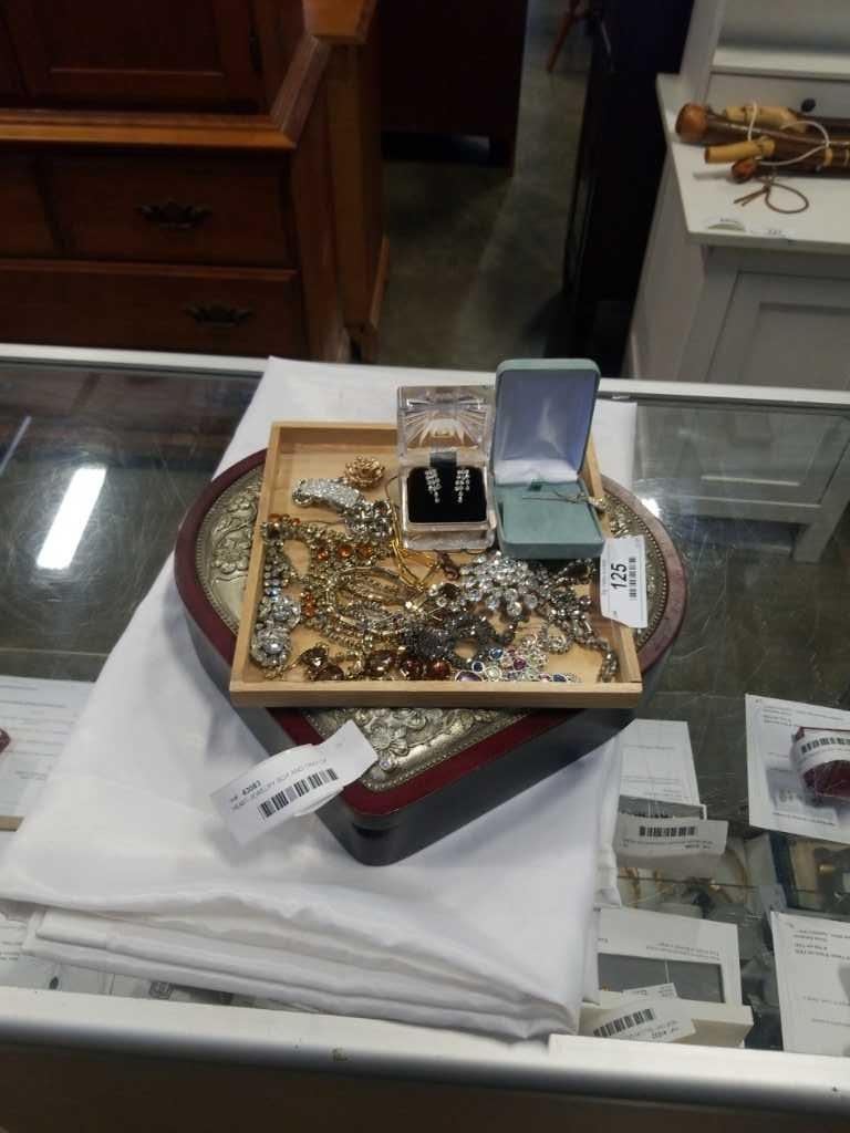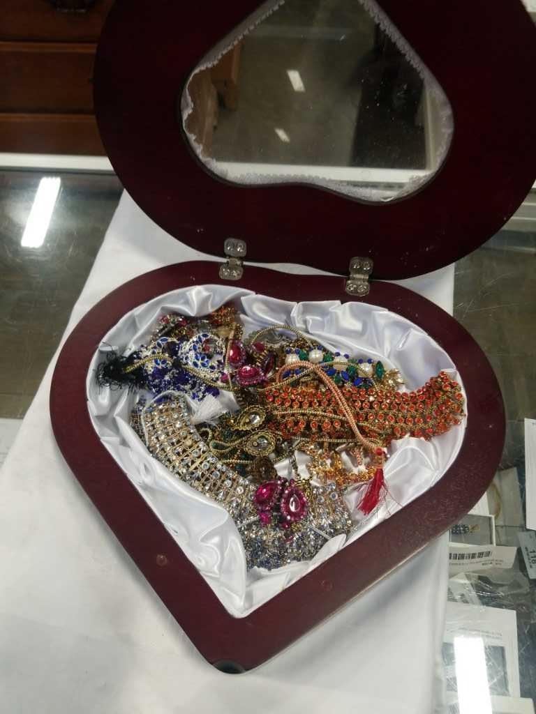 HEART JEWELRY BOX AND TRAY OF RHINESTONE JEWELRY