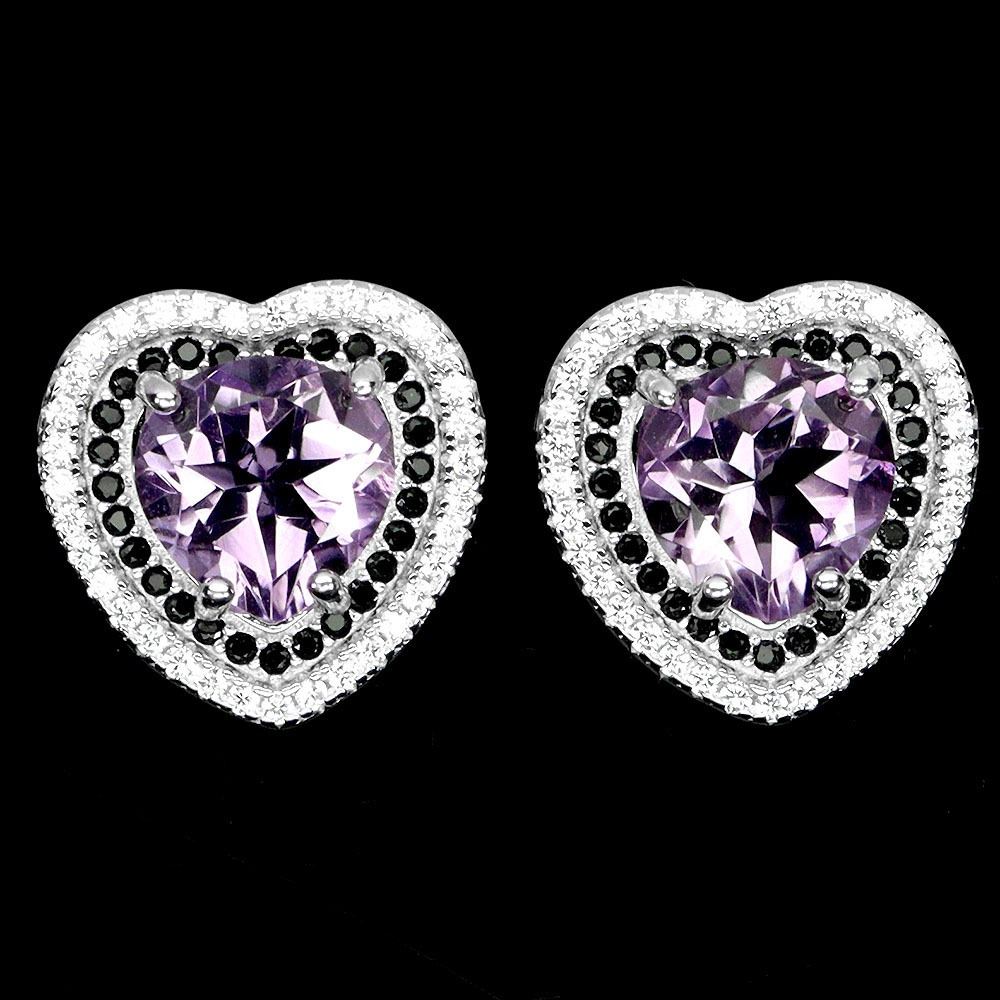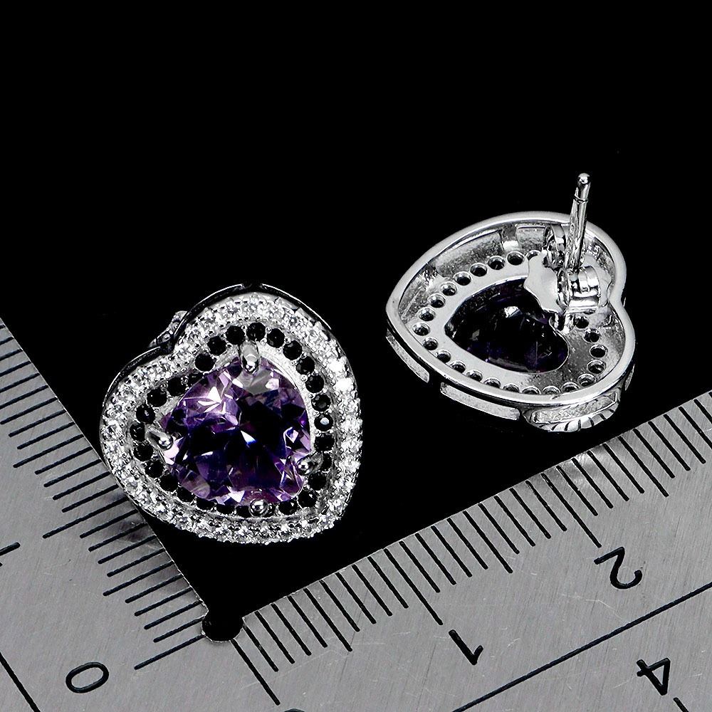 HEART SHAPED AMETHYST AND BLACK SPINEL EARRINGS IN 14K WHITE PLATED GOLD OVER 925 STERLING SILVER - APPRAISED REPLACEMENT VALUE
