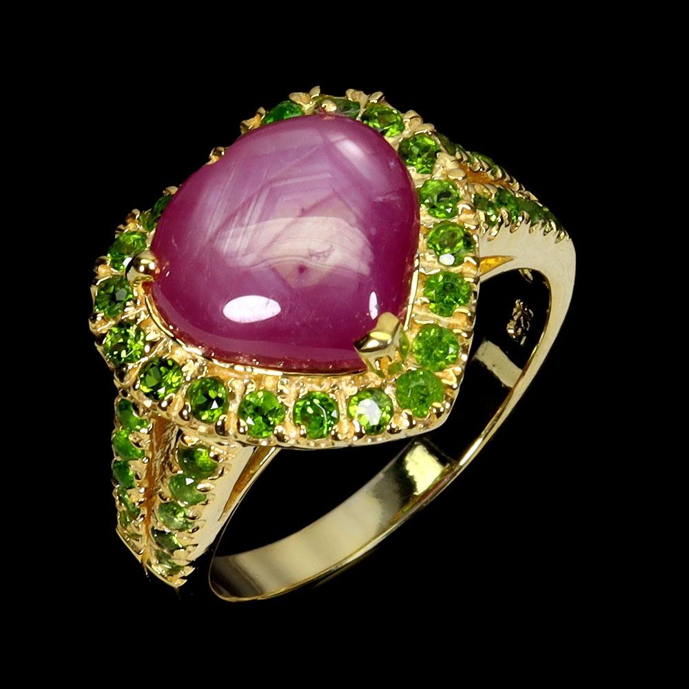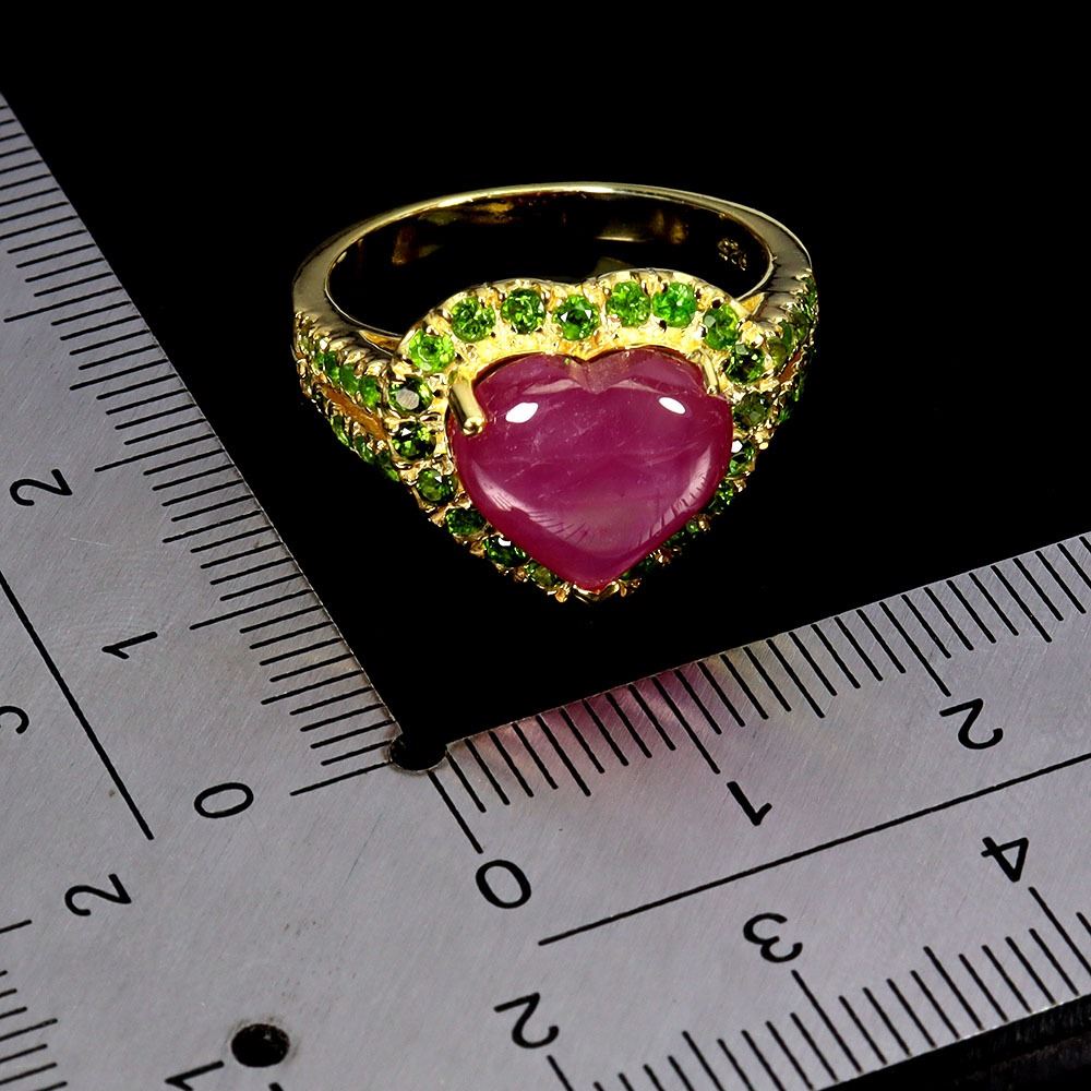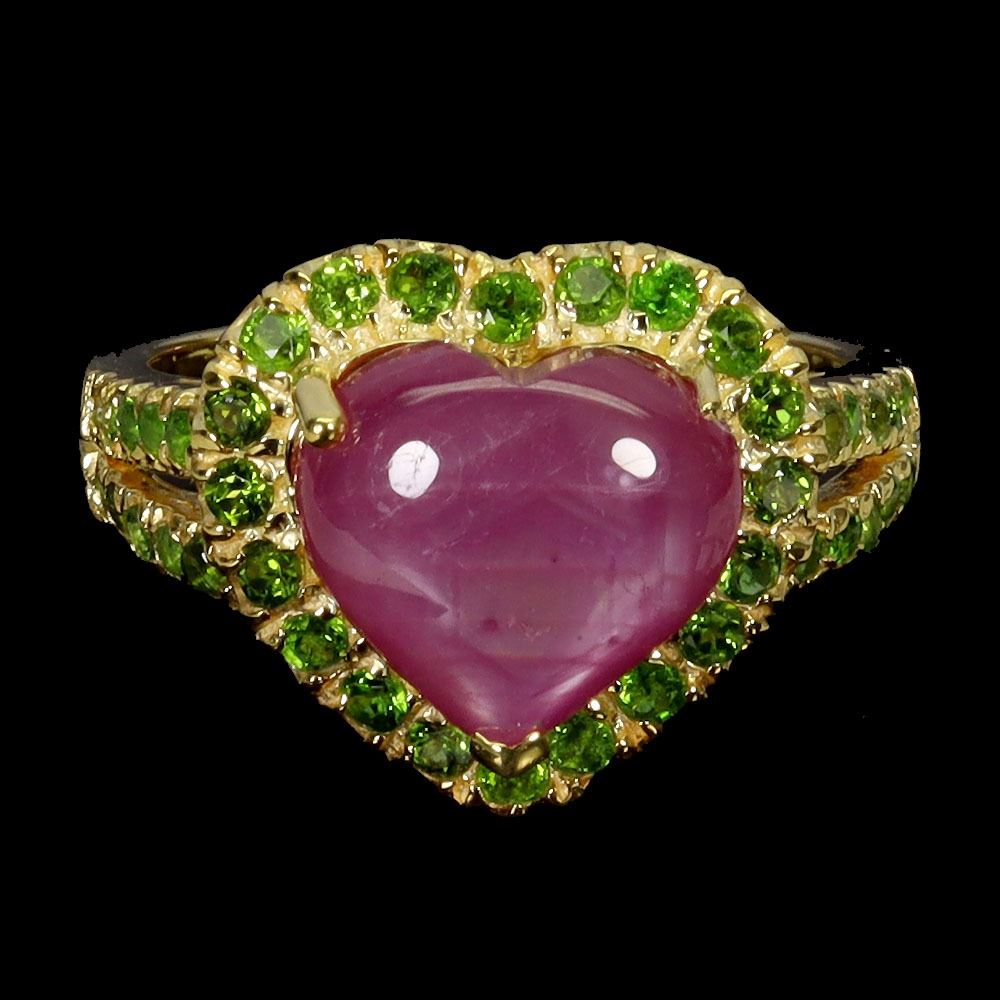 HEART SHAPED RUBY AND CHROME DIOPSIDE RING IN 14K YELLOW PLATED GOLD OVER 925 STERLING SILVER -SIZE 8 - APPRAISED REPLACEMENT VALUE