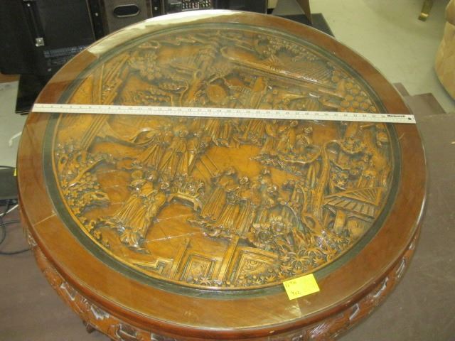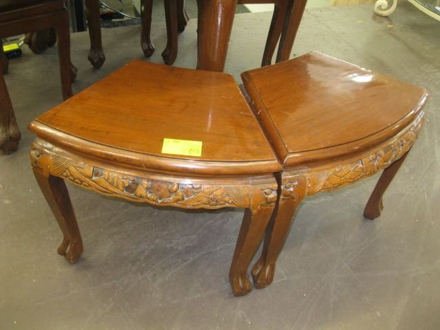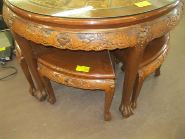 HEAVILY CARVED TABLE WITH 5 STOOLS WITH CLAW FEET