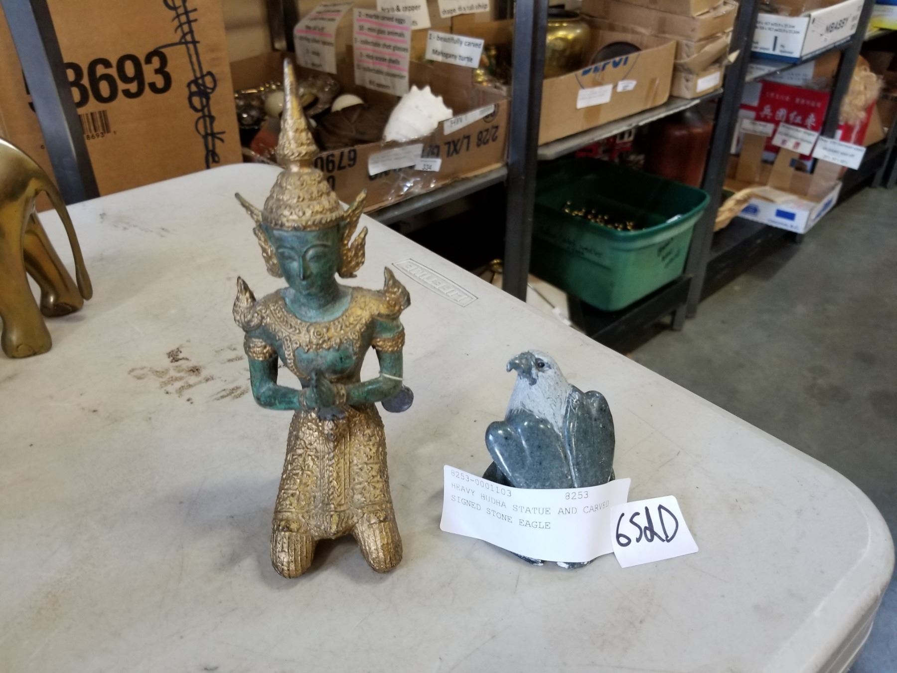 HEAVY BUDHA STATUE AND CARVED SIGNED STONE EAGLE