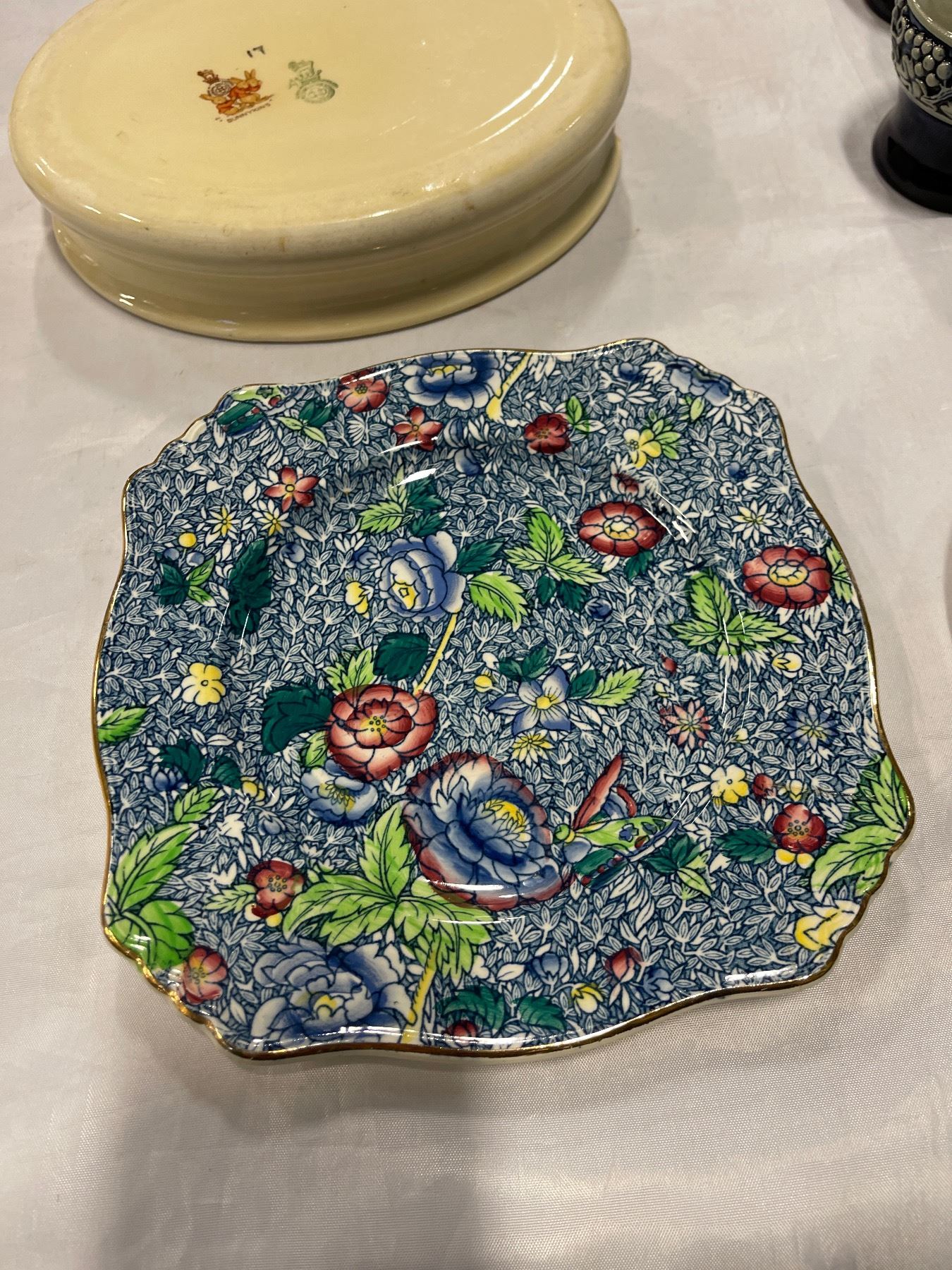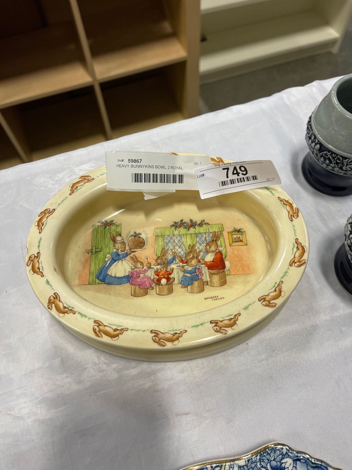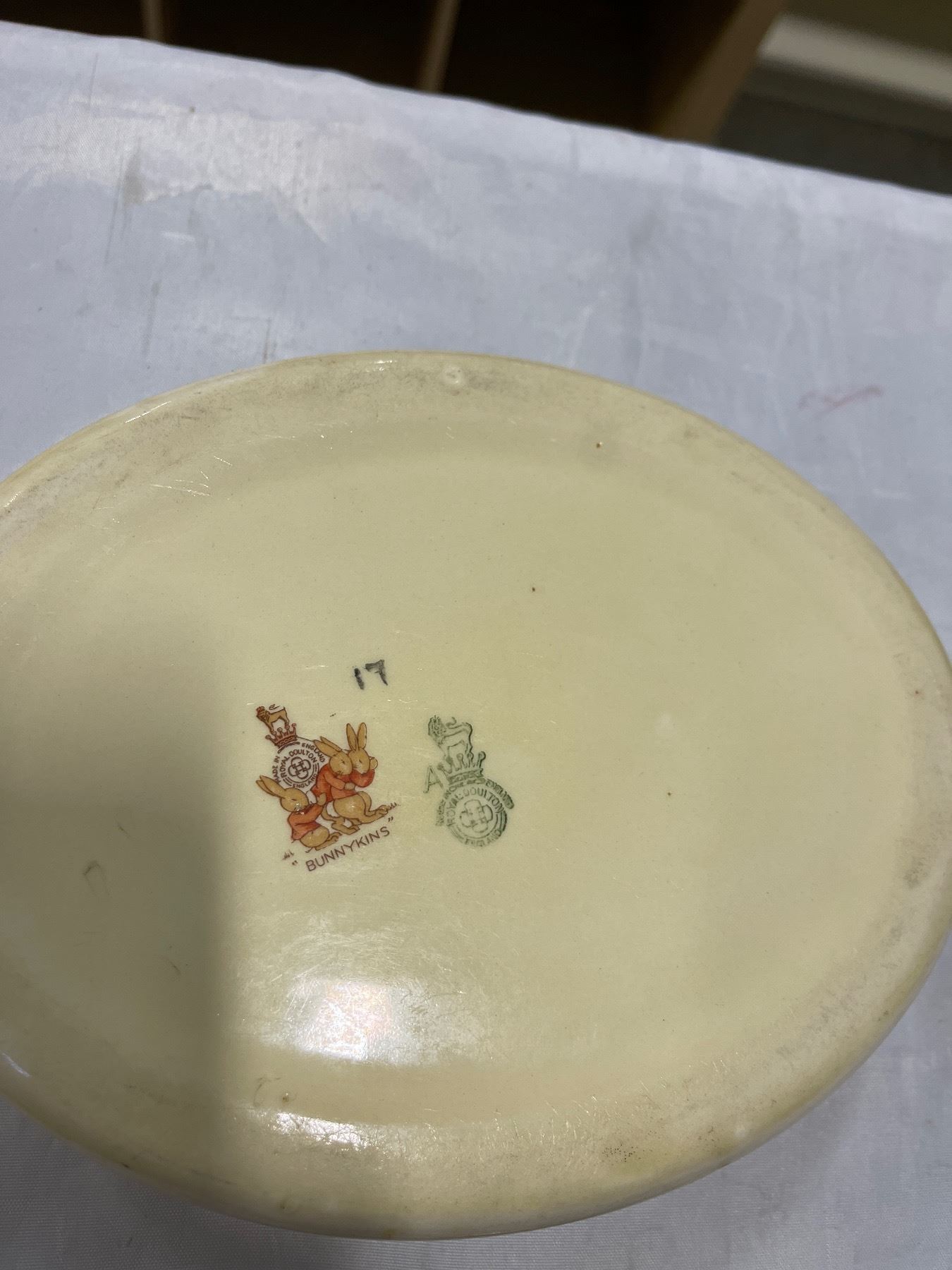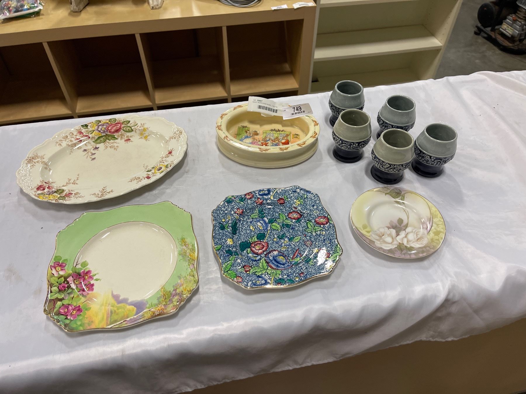HEAVY BUNNYKINS BOWL, 2 ROYAL WINTON GRIMWADES PLATES, POTTERY CUPS