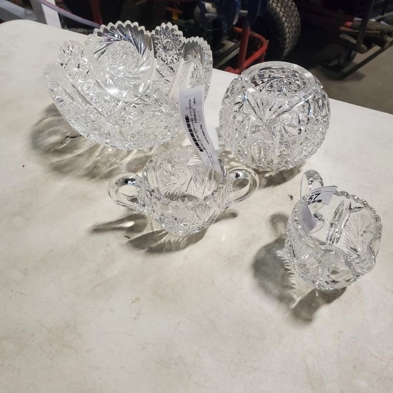 HEAVY CUT CRYSTAL BOWLS, CREAM AND SUGAR ETC