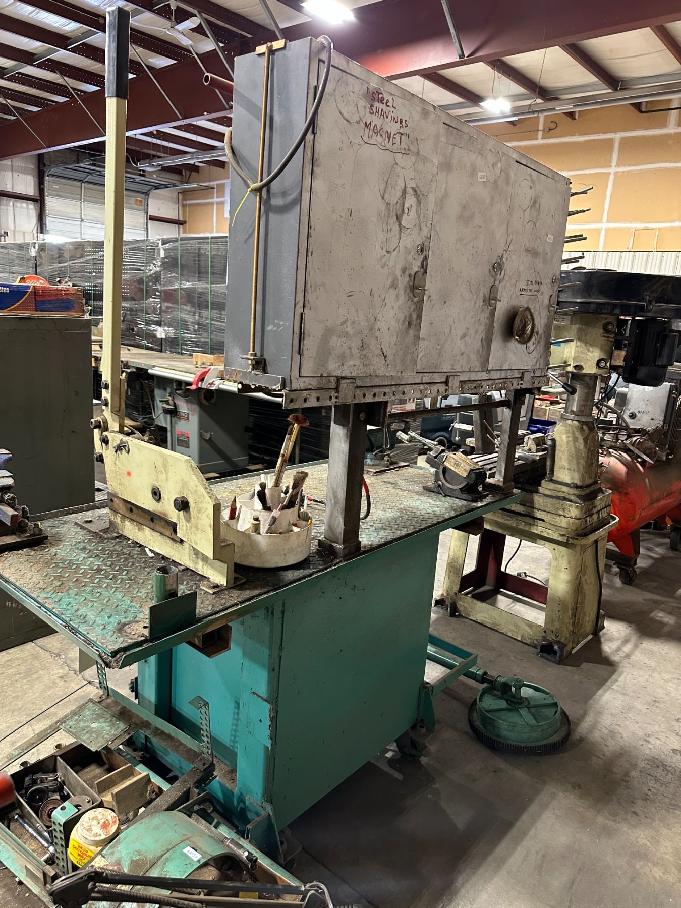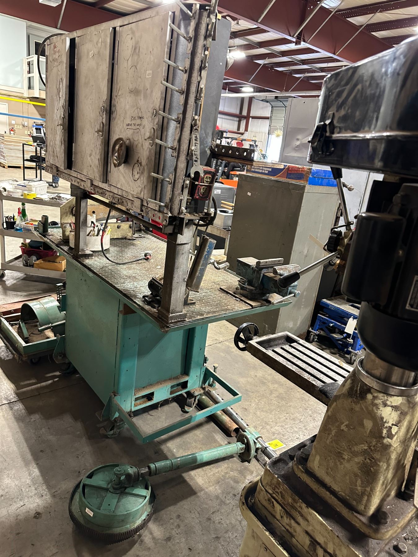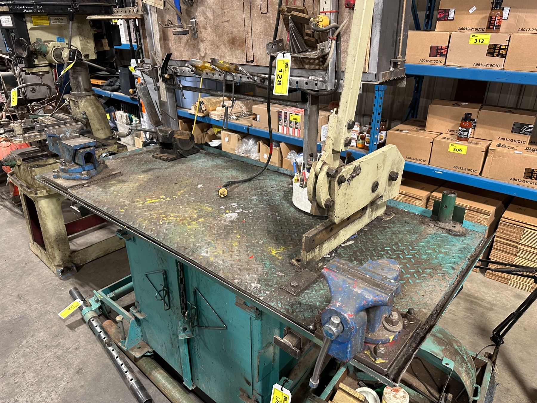 HEAVY DUTY GREEN METAL MOBILE WORK STATION WITH BENCH SHEAR, NO. 455 BENCH VISE, LARGE BLUE BENCH VISE, POLE SEAT, ASSORTED DIES & TOOLS BENCH SIZE 64"W X 30"D X 75"H ( 4 WHEEL CART NOT INCLUDED )