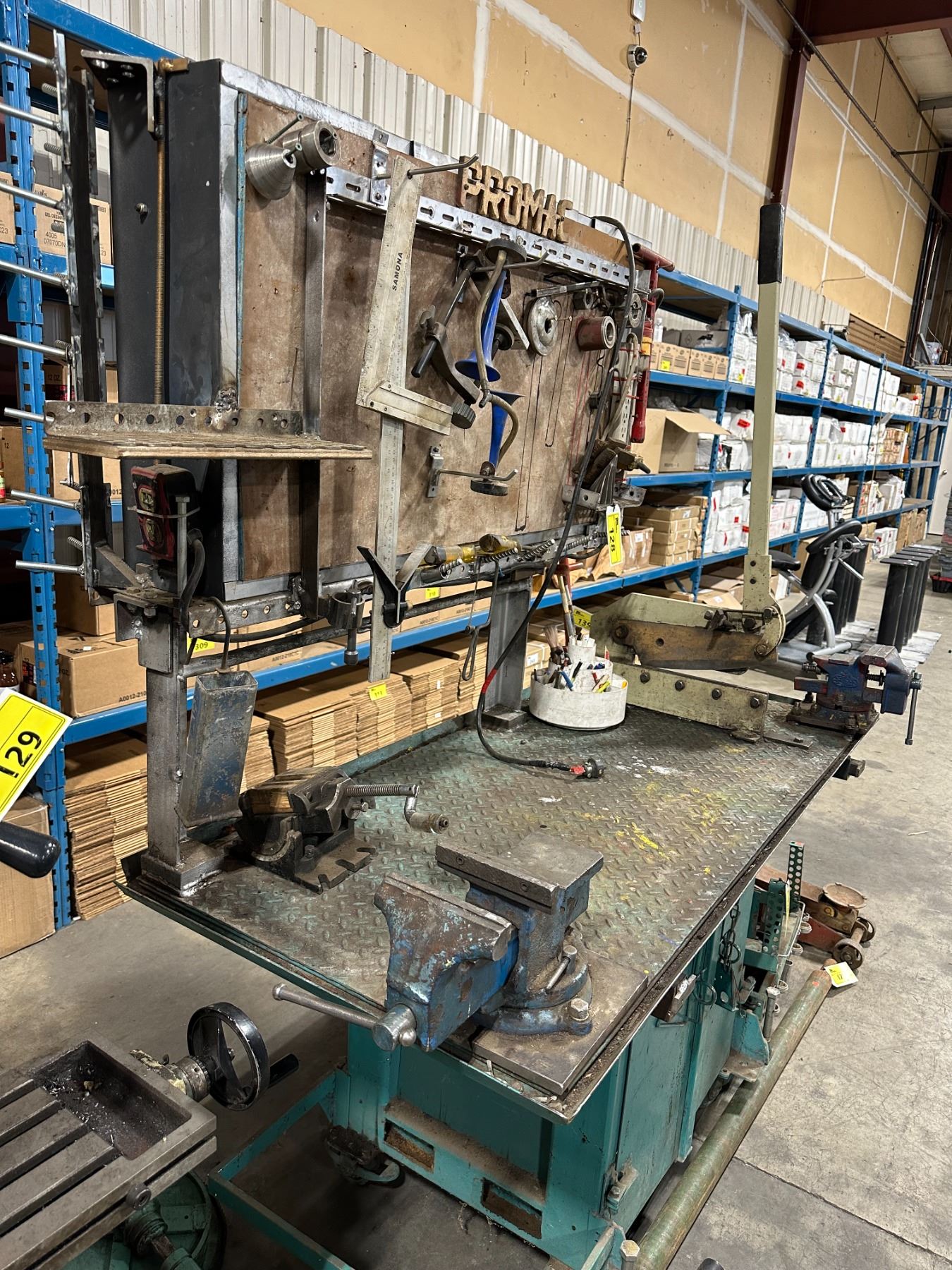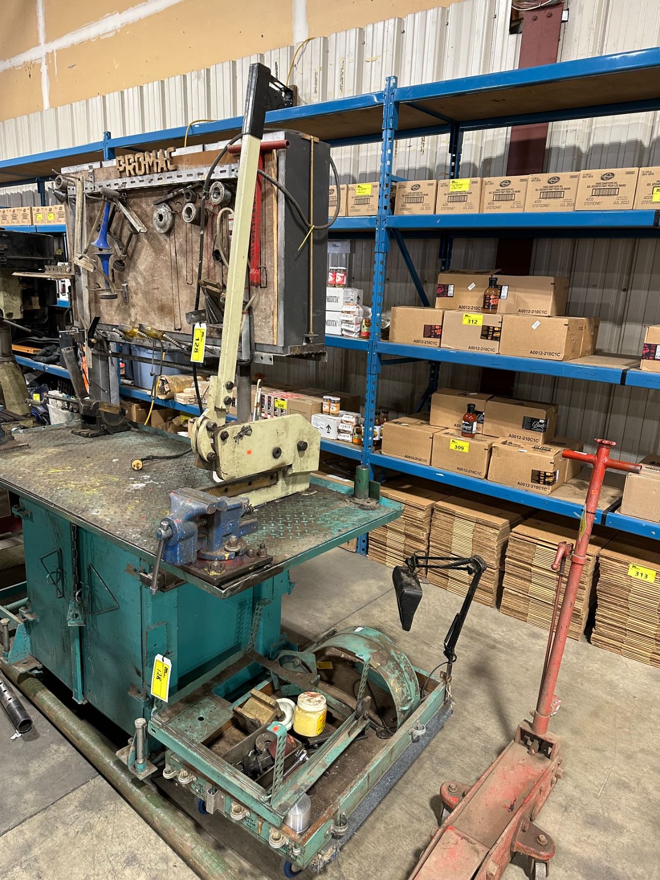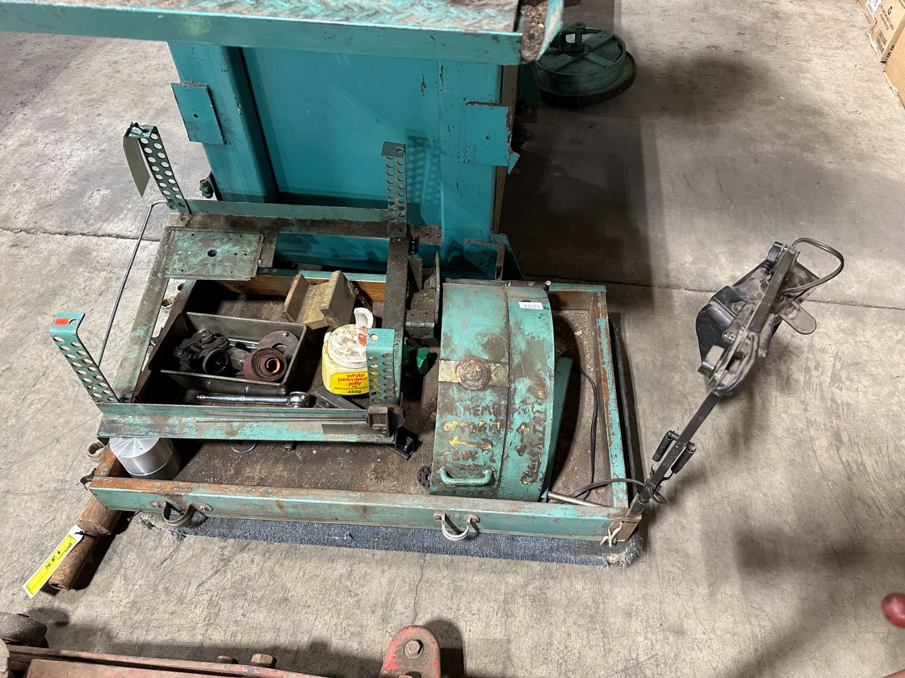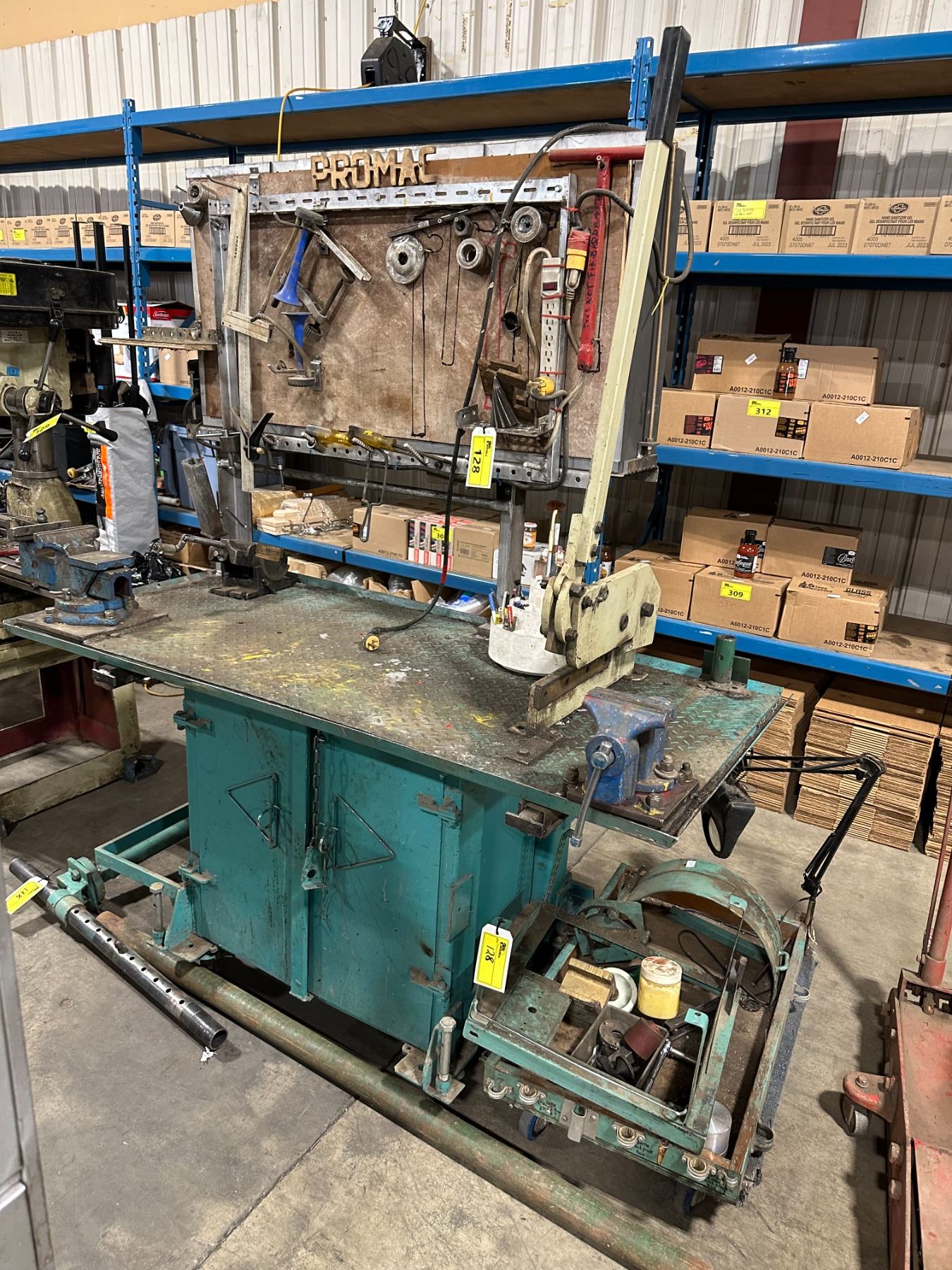 HEAVY DUTY GREEN METAL MOBILE WORK STATION WITH BENCH SHEAR, NO. 455 BENCH VISE, LARGE BLUE BENCH VISE, POLE SEAT, ASSORTED DIES & TOOLS BENCH SIZE 64"W X 30"D X 75"H ( 4 WHEEL CART NOT INCLUDED )