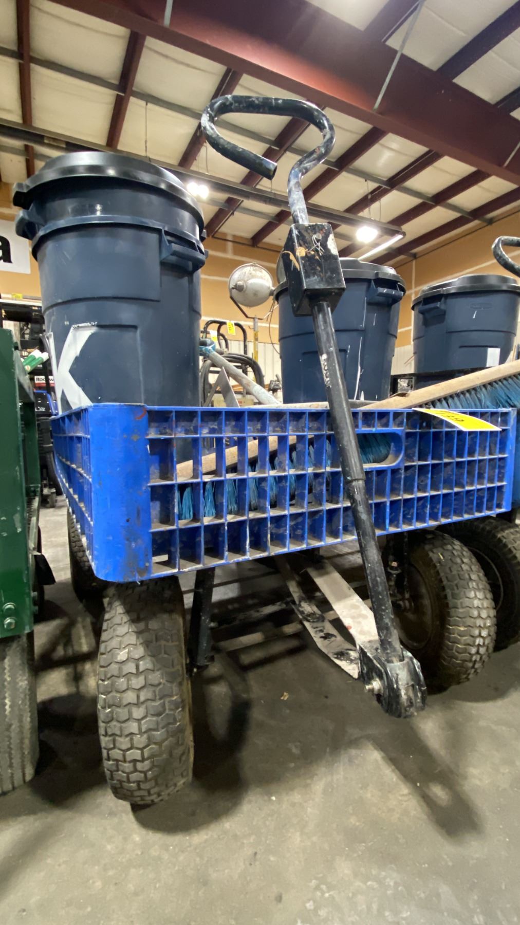 HEAVY DUTY PLASTIC ALL TERRAIN GARDEN WAGON WITH 2 GARBAGE CANS, SHOVEL, PUSH SQUEEGEE & PUSH BROOM
