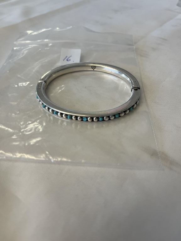 HEAVY SILVER W/ SMALL TURQUOISE STONES (3 MISSING) HUNGED BANGLE BRACELET, DESIGNER INITIAL WEIGHT 34.3G