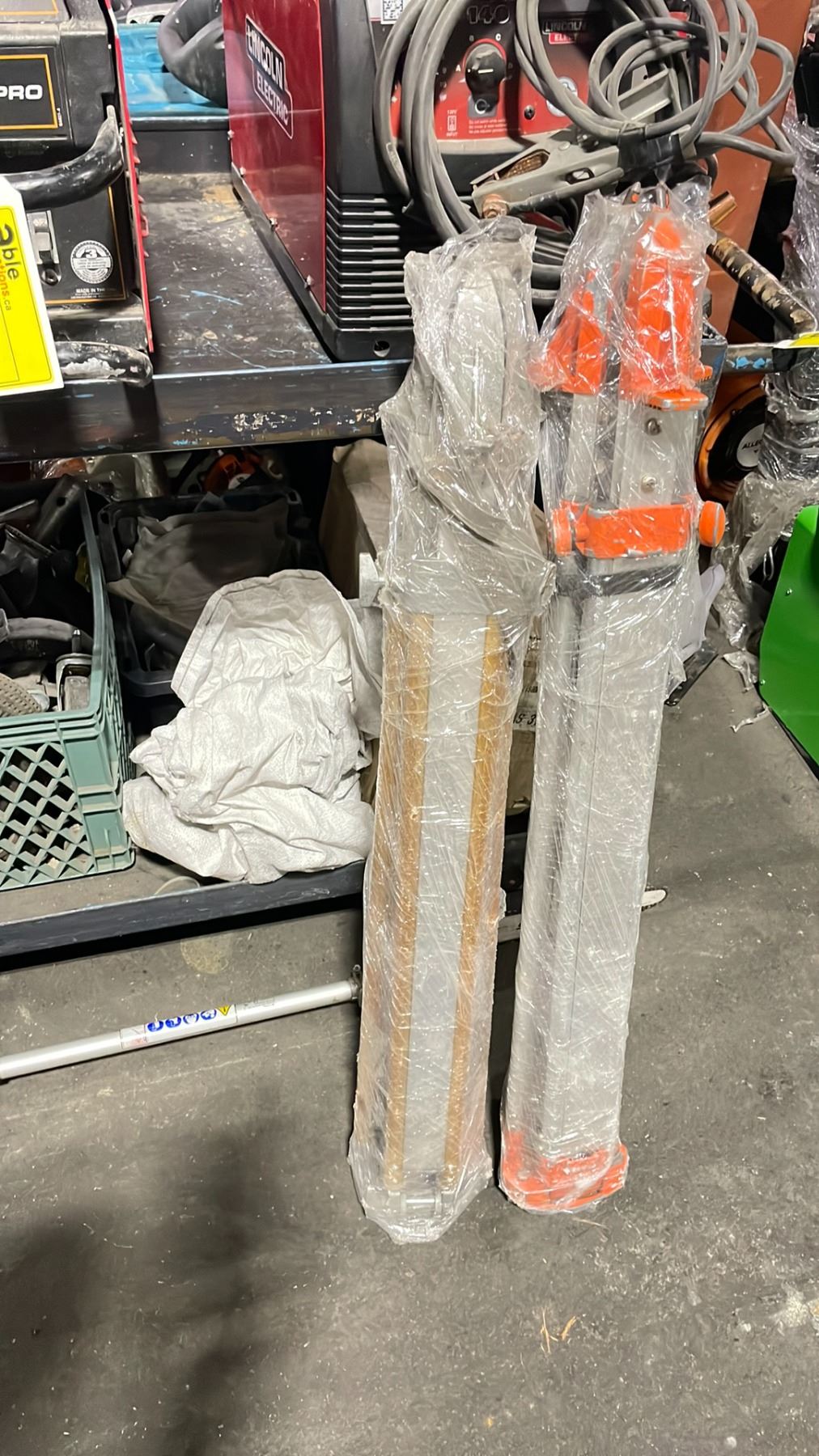 HI-LIFT HYDRAULIC FRAME JACK IN SOFT BAG WITH 2 COMMERCIAL INDUSTRIAL SURVEYORS TRI-PODS