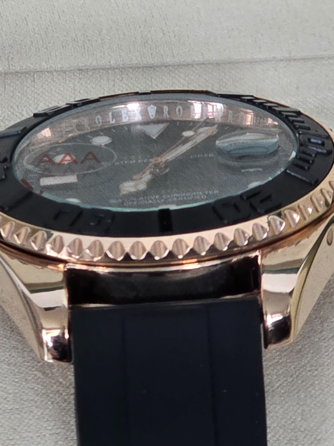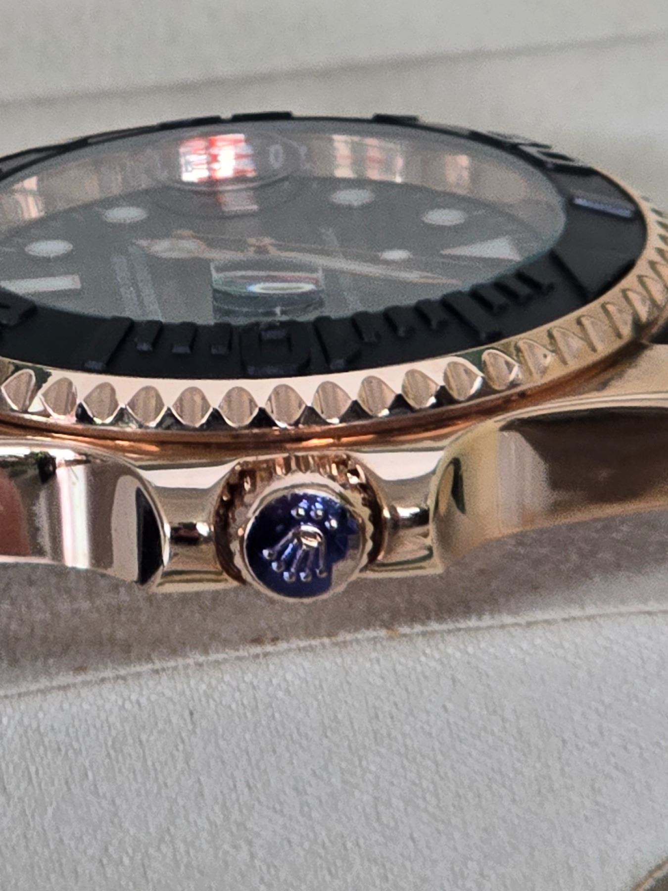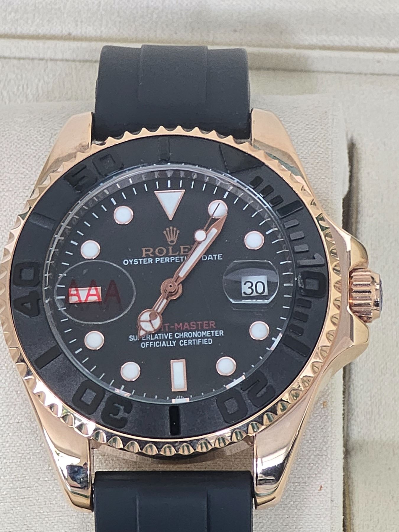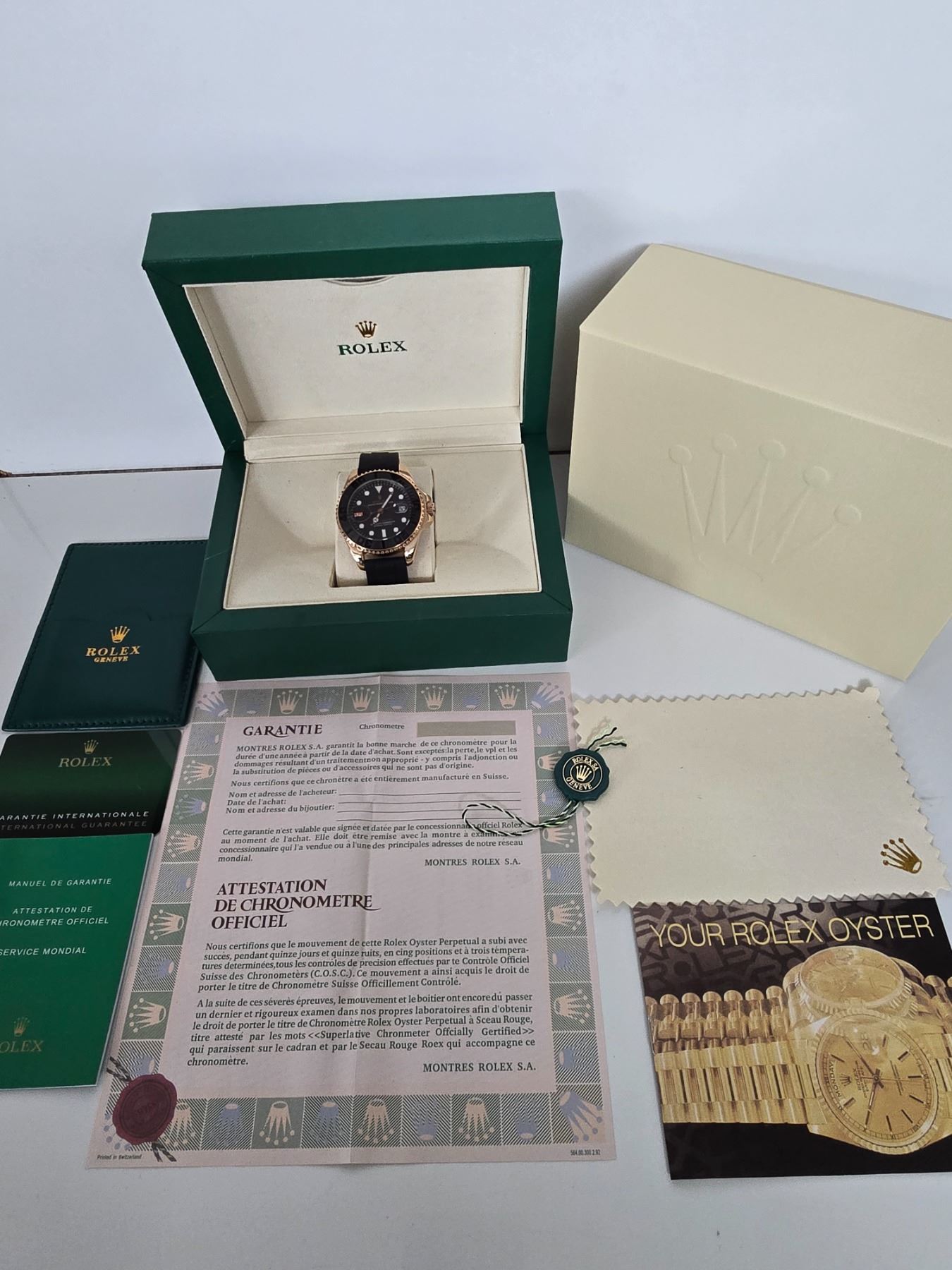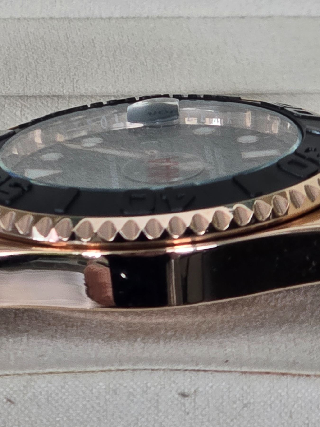 HIGHLY SOUGHT FULLY AUTOMATIC ROLEX YACHT-MASTER EVEROSE GOLD HIGH QUALITY REPLICA WATCH, REF# M-126655-0002 INTENSE BLACK DIAL WITH WHITE INDEXES BLACK CERAMIC BEZEL 904L STAINLESS STEEL CASE (THE SAME STEEL USED IN AUTHENTIC ROLEX WATCHES) OYSTERFLEX BRACELET. FULL SET WITH BOX, PAPERS AND BAG.