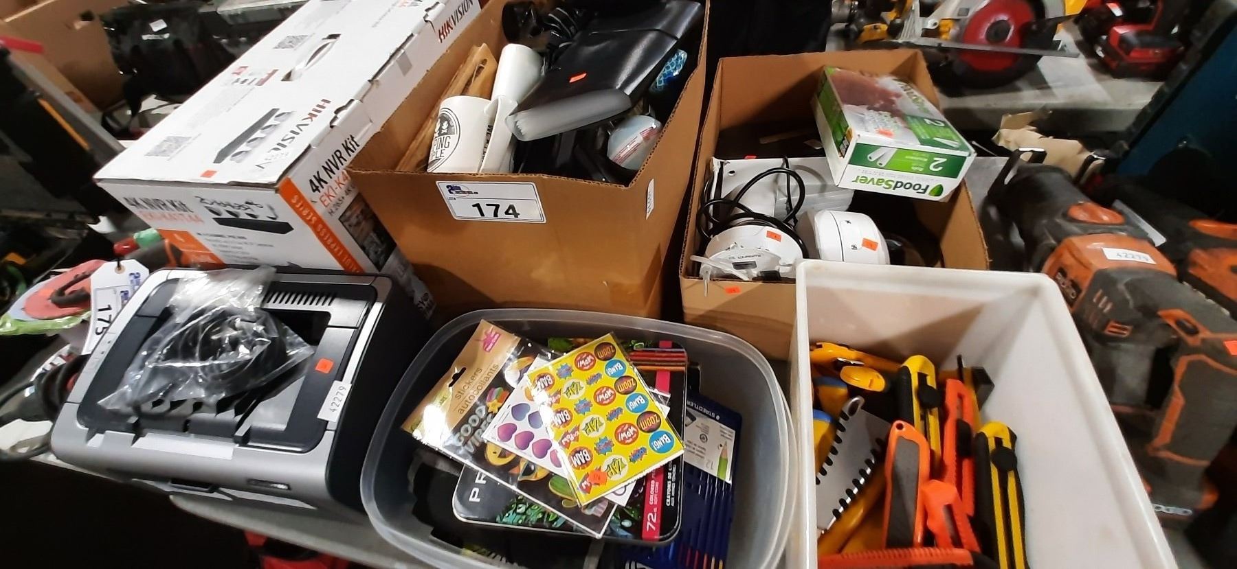 HIKVISION EKI-K41T44 4K NVR SECURITY CAMERA KIT, HP LASERJET P1006, BOX OF ASSORTED BOX CUTTERS,
