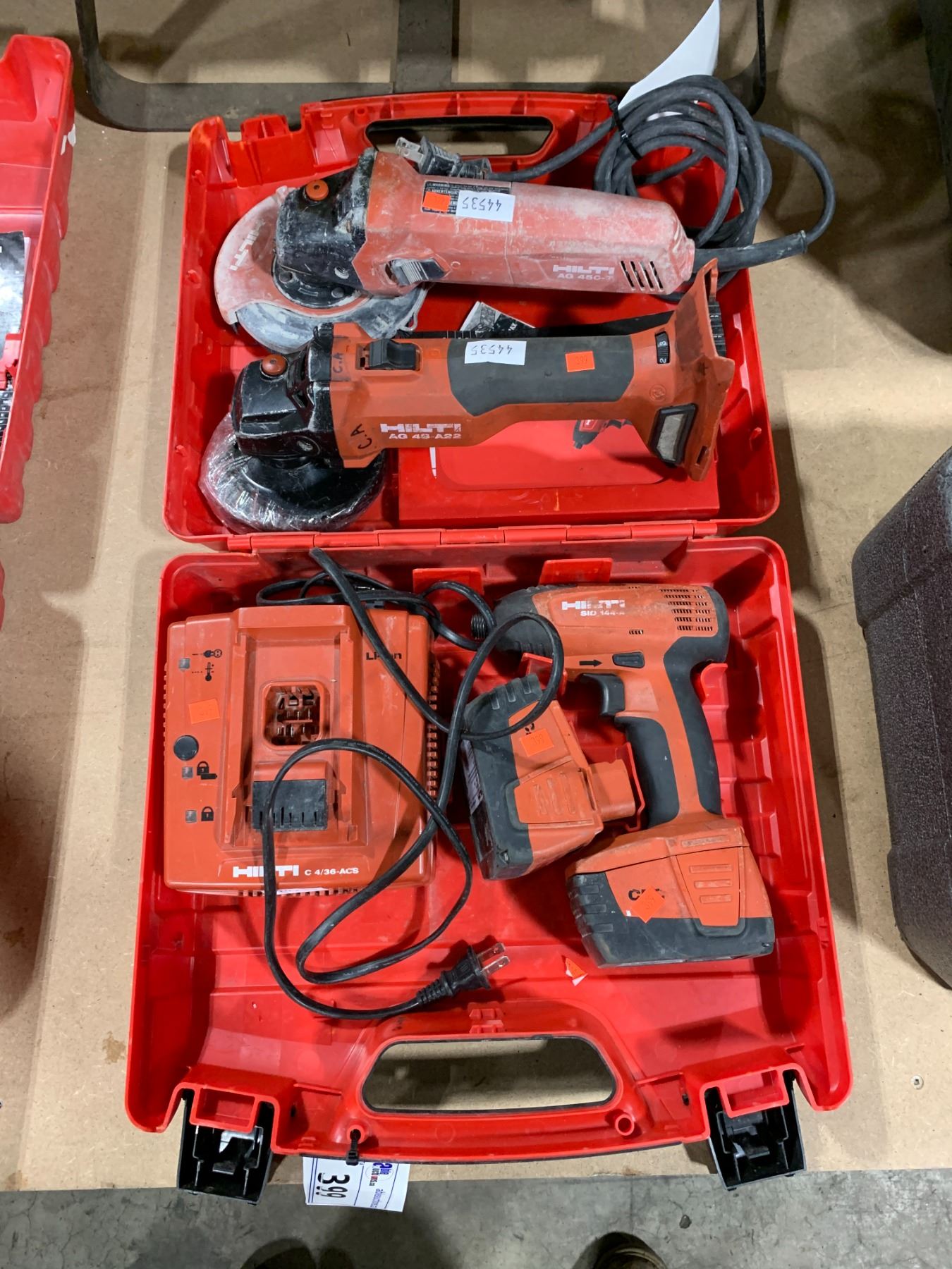 HILTI CORDED AG 450-7 TILE GRINDER, HILTI AG 4S-A22 CORDLESS GRINDER, HILTI SID 144-A CORLESS IMPACT AND HILTI C 4/36-ACS BATTERY CHARGER IN HARD TRAVEL CASE