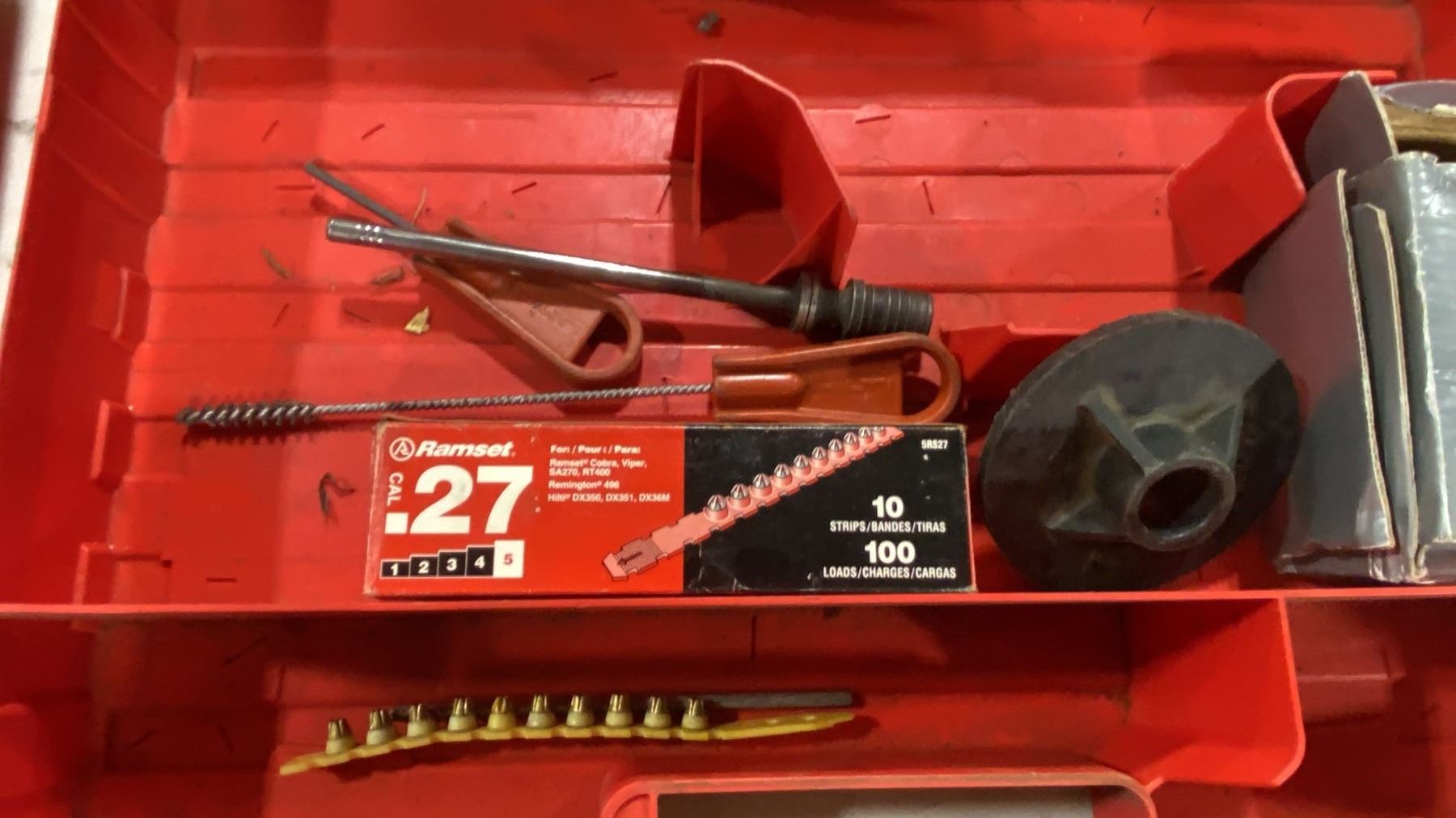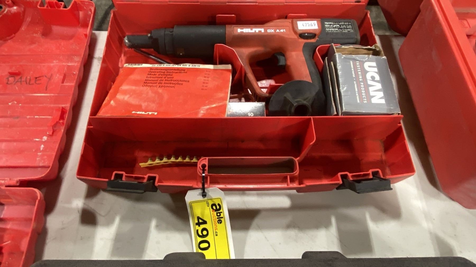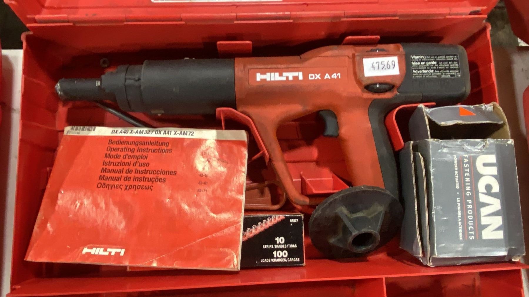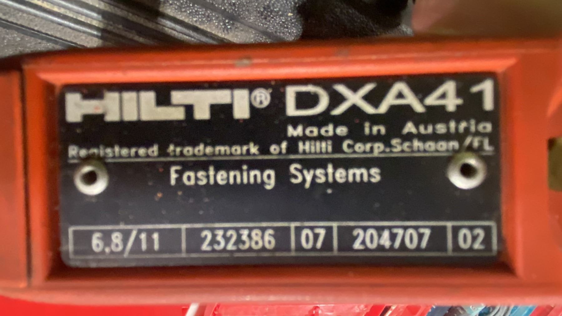 HILTI DX A41 INDUSTRIAL AIR ACTUATED GUN IN HARD TRANSPORT CASE WITH ASSORTED CAPS & HARDWARE