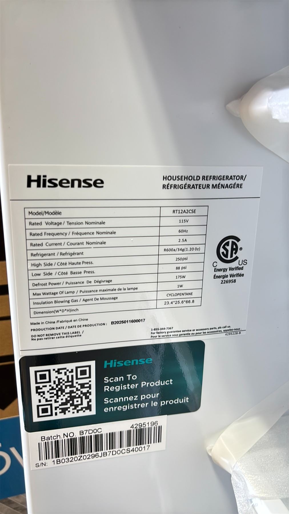 HISENSE RT12A2CSE 24" STAINLESS STEEL 11.5" CU. FT TOP FREEZER REFRIGERATOR