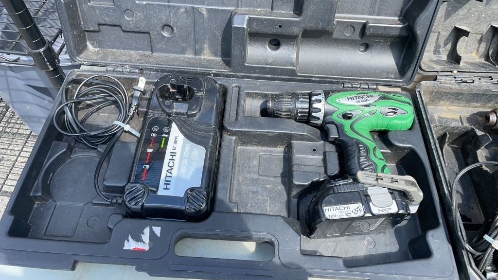 HITACHI CORDLESS DRILL WITH BATTERY WORKING, DEWALT CORDLESS DRILL AND CHARGER NO BATTERY, PALM SAND