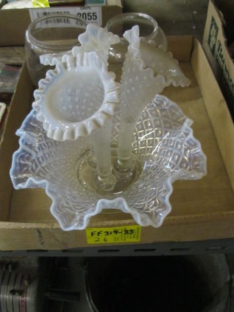 HOBNAIL BOWL WITH 3 FLUTED VASES & 2 LANTERN SHADES